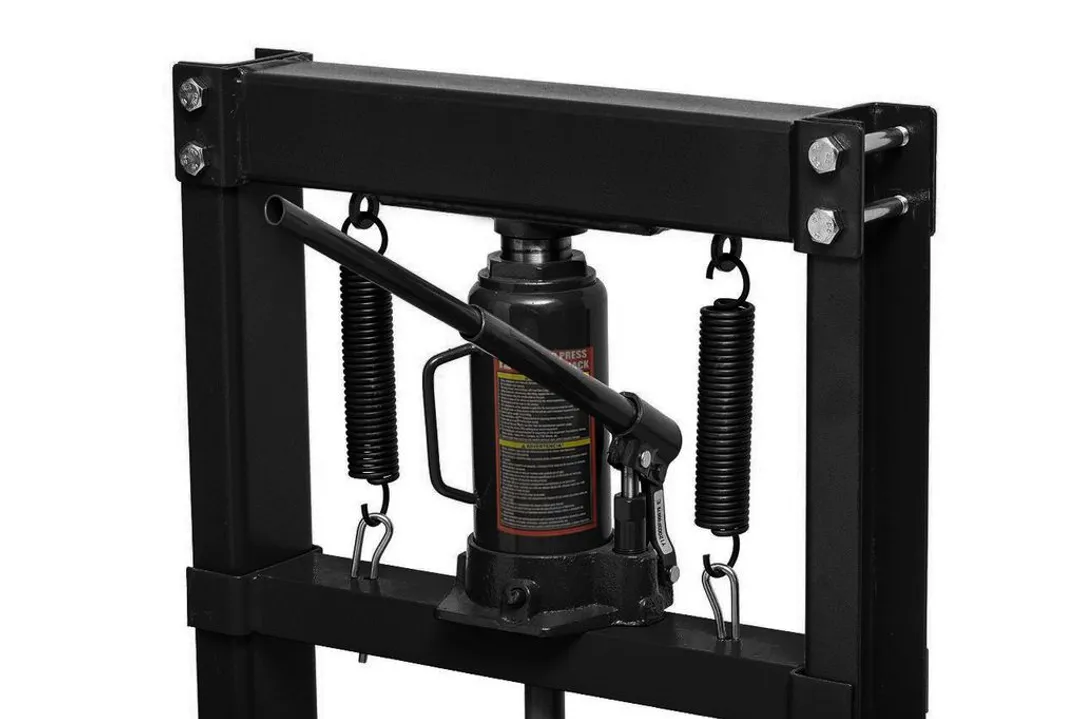 Напольный гидравлический пресс под бутылочный домкрат приводится в действие при помощи рукояти. Устойчивое положение модели обеспечивается благодаря поперечным пластинам основания. Отверстия стоек позволяют с легкостью менять высоту стола.
