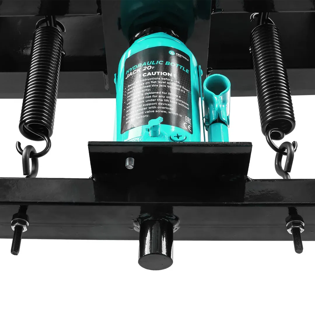 Напольный гидравлический пресс под бутылочный домкрат приводится в действие при помощи рукояти. Устойчивое положение модели обеспечивается благодаря поперечным пластинам основания. Отверстия стоек позволяют с легкостью менять высоту стола.