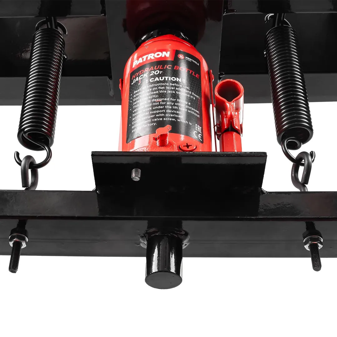 Напольный гидравлический пресс под бутылочный домкрат приводится в действие при помощи рукояти. Устойчивое положение модели обеспечивается благодаря поперечным пластинам основания. Отверстия стоек позволяют с легкостью менять высоту стола.