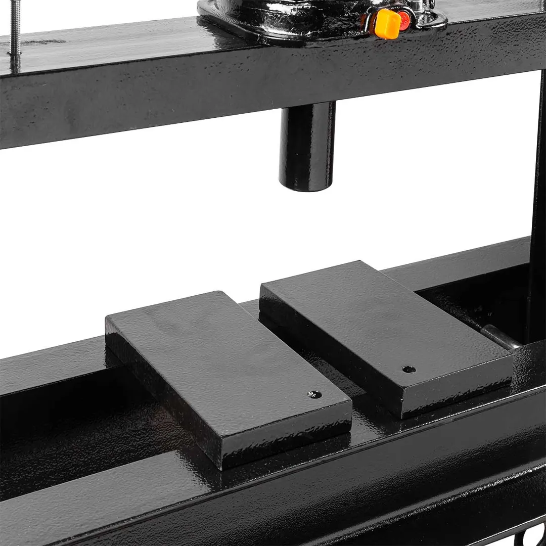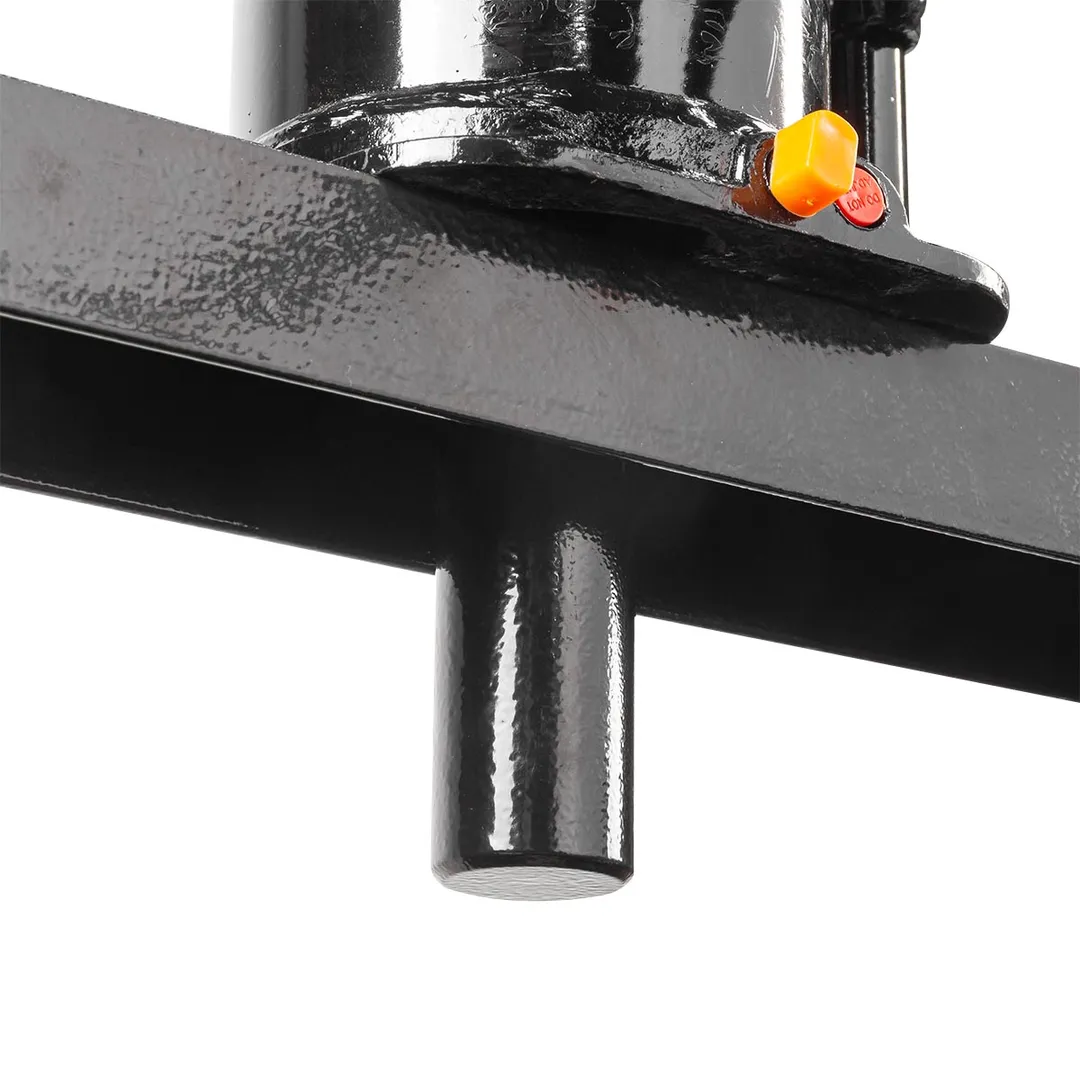 Напольный гидравлический пресс под бутылочный домкрат приводится в действие при помощи рукояти. Устойчивое положение модели обеспечивается благодаря поперечным пластинам основания. Отверстия стоек позволяют с легкостью менять высоту стола.