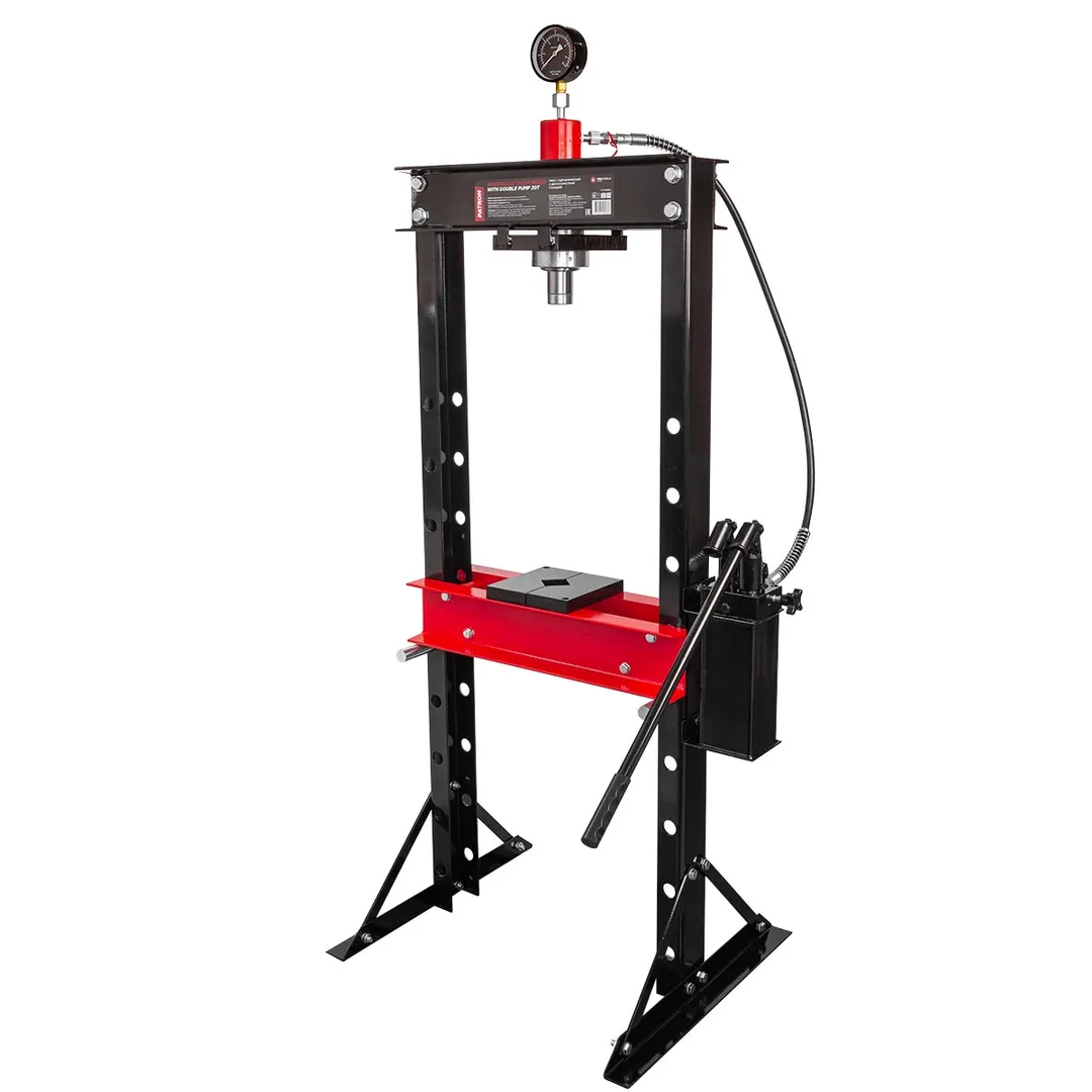 Напольный гидравлический пресс приводится в действие при помощи рукояти. Устойчивое положение модели обеспечивается благодаря поперечным пластинам основания. Отверстия стоек позволяют с легкостью менять высоту стола. Пресс также оснащён манометром, служащим для контролирования давления.