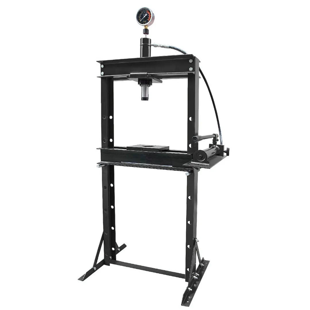Напольный гидравлический пресс приводится в действие при помощи рукояти. Устойчивое положение модели обеспечивается благодаря поперечным пластинам основания. Отверстия стоек позволяют с легкостью менять высоту стола. Пресс также оснащён манометром, служащим для контролирования давления.