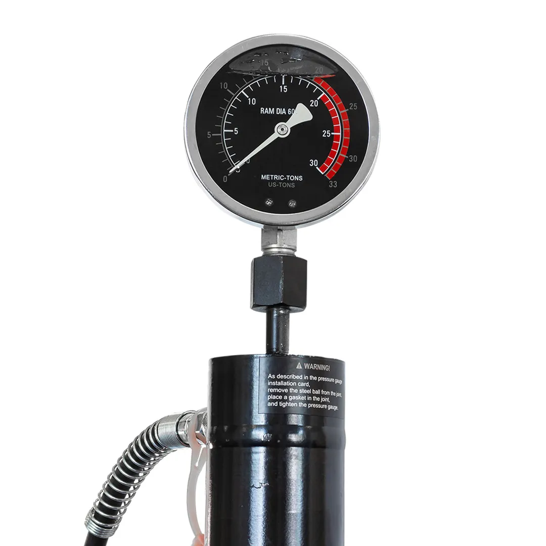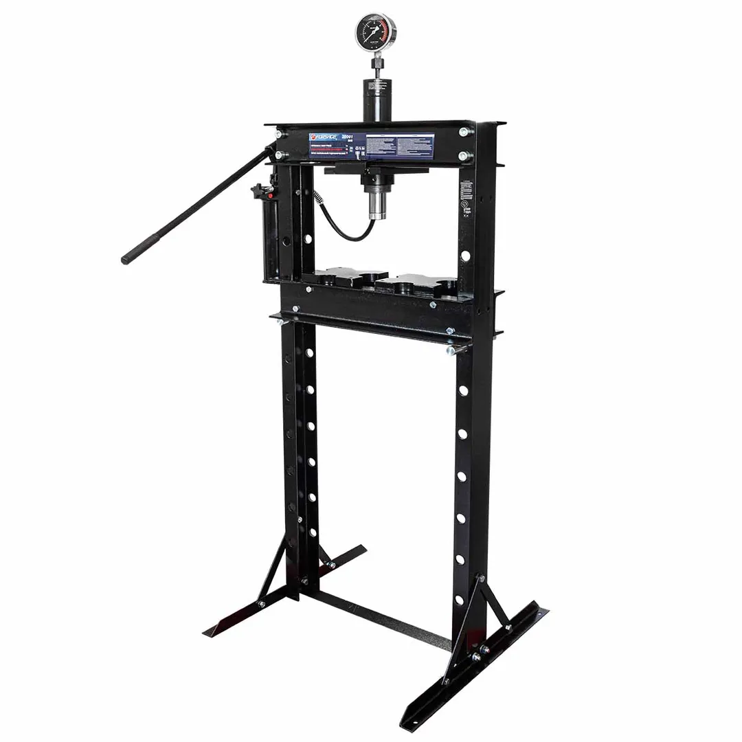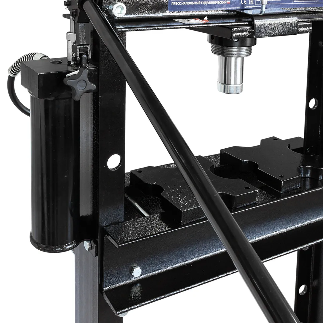 Напольный гидравлический пресс приводится в действие при помощи рукояти. Устойчивое положение модели обеспечивается благодаря поперечным пластинам основания. Отверстия стоек позволяют с легкостью менять высоту стола. Пресс также оснащён манометром, служащим для контролирования давления.