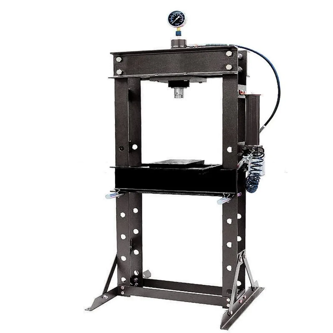Напольный гидравлический пресс приводится в действие при помощи рукояти. Устойчивое положение модели обеспечивается благодаря поперечным пластинам основания. Отверстия стоек позволяют с легкостью менять высоту стола. Пресс также оснащён манометром, служащим для контролирования давления.