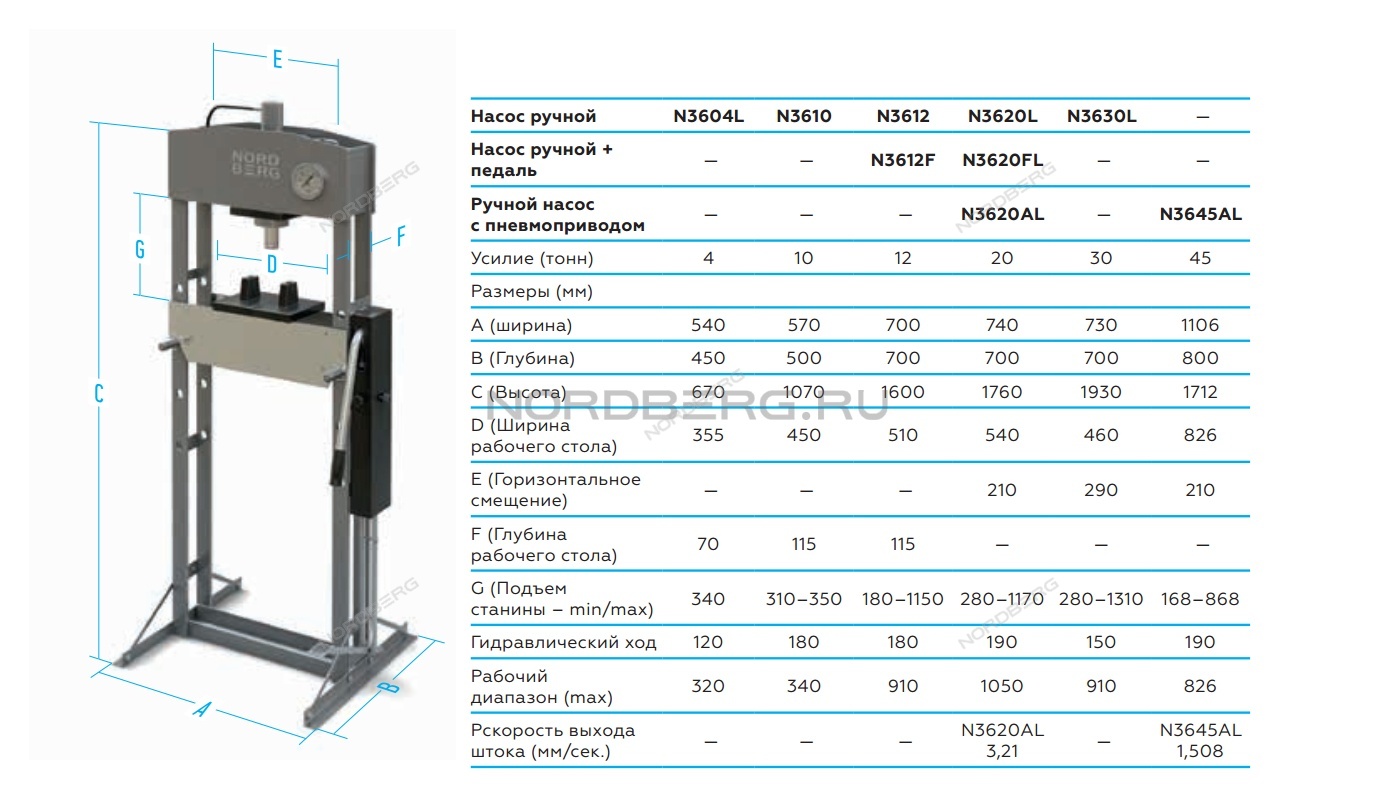 Гидравлический пресс NORDBERG ECO N3620L обеспечивает высокое усилие прижима благодаря качественной современной системе гидравлики с приводом ручного типа. Напольная модель не шатается и не опрокидывается благодаря устойчивой конструкции основания. Рабочий стол агрегата поддается регулировке по высоте (в станине предусматриваются многочисленные отверстия).