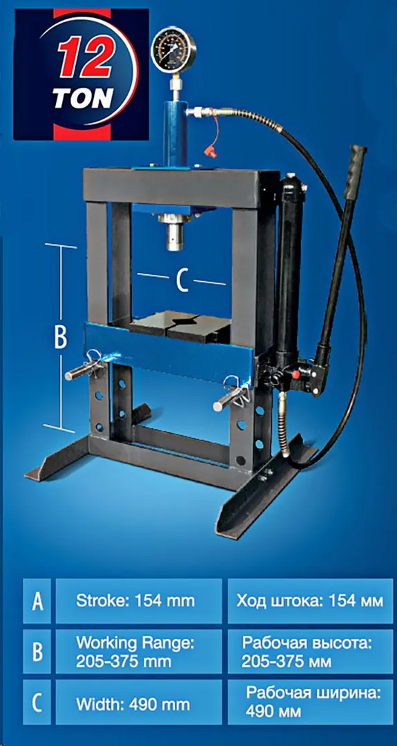 Настольный гидравлический пресс приводится в действие при помощи рукояти. Устойчивое положение модели обеспечивается благодаря поперечным пластинам основания. Отверстия стоек позволяют с легкостью менять высоту стола. Пресс также оснащён манометром, служащим для контролирования давления.
