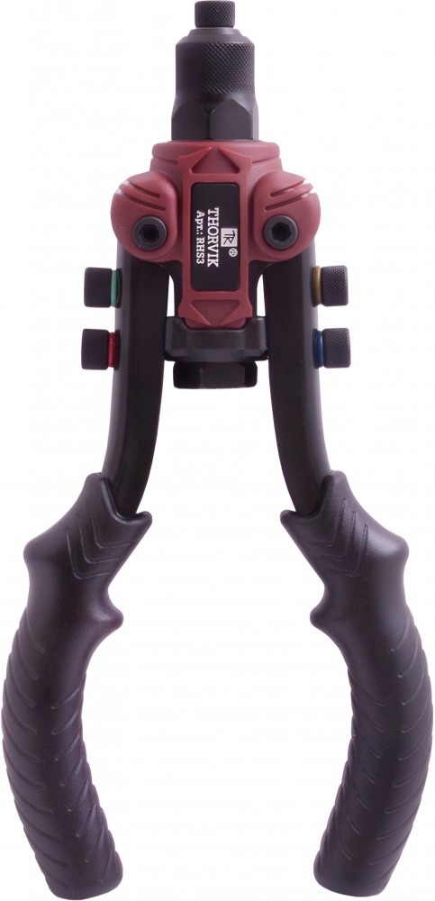 Ручной рычажный усиленный заклепочник THORVIK предназначен для работы с резьбовыми и вытяжными заклепками с алюминиевыми и стальными сердечниками. В комплект поставки входят две просечки круглого и прямоугольного сечения для работы с листовым металлом. Заклепочник имеет алюминиевый корпус и рычаги, изготовленные из закаленной углеродистой стали.
