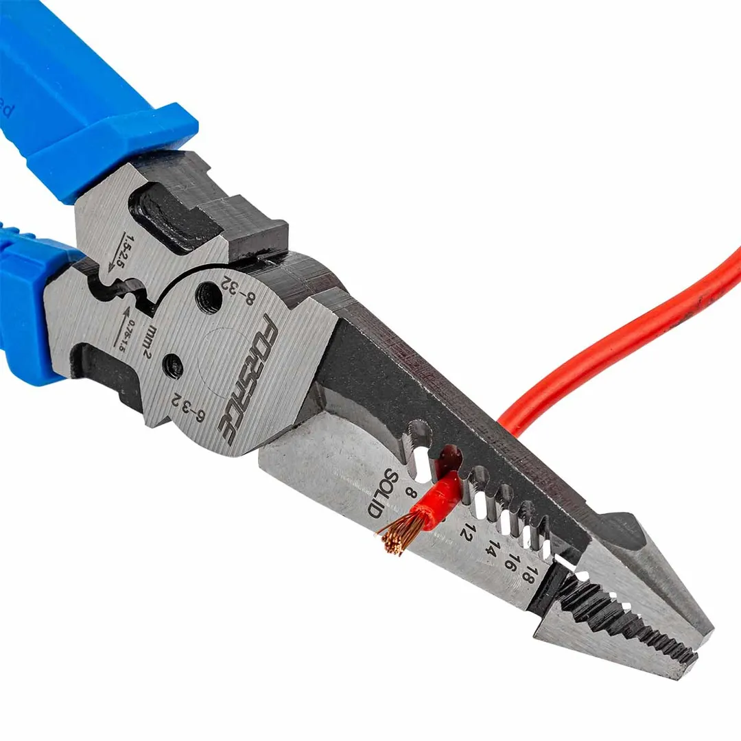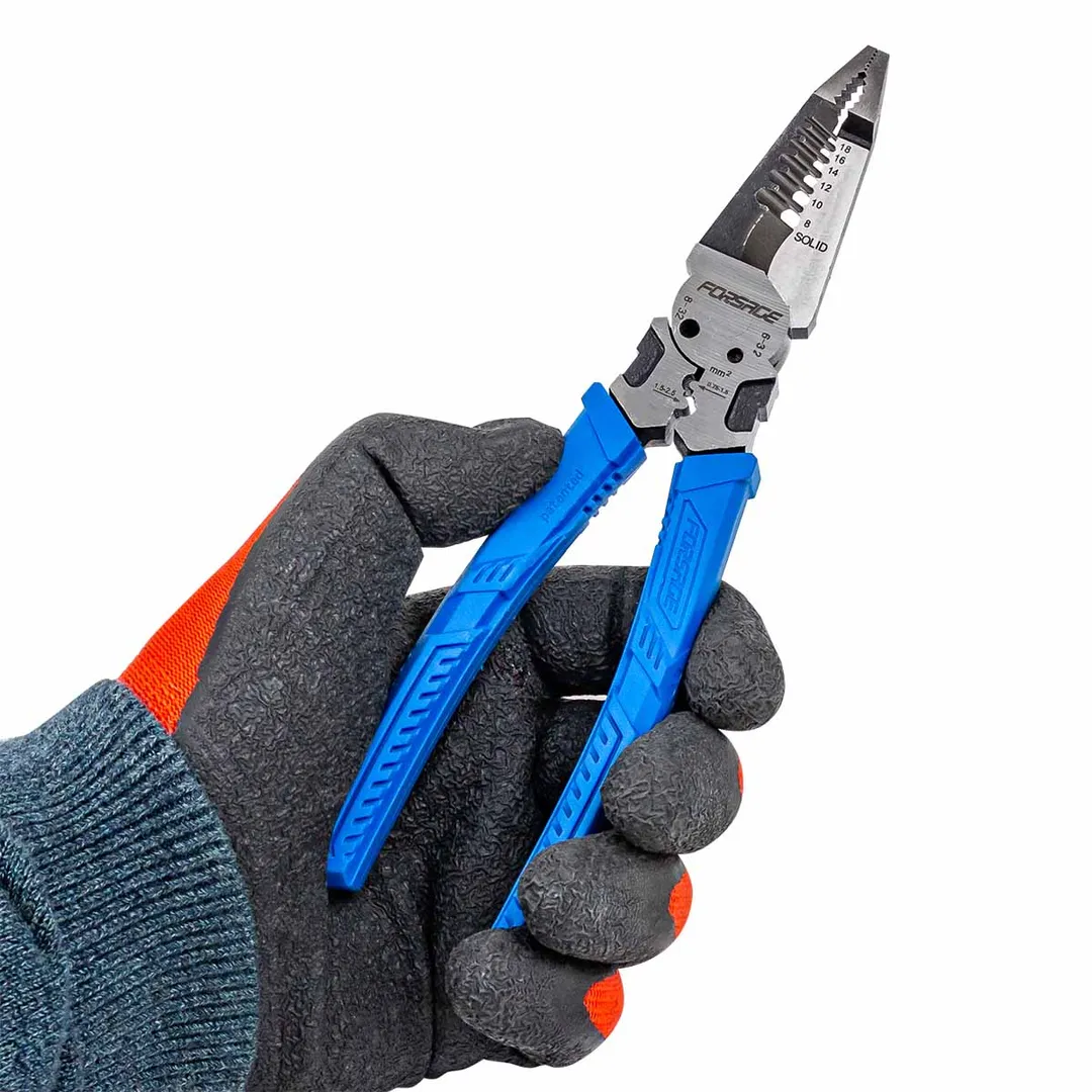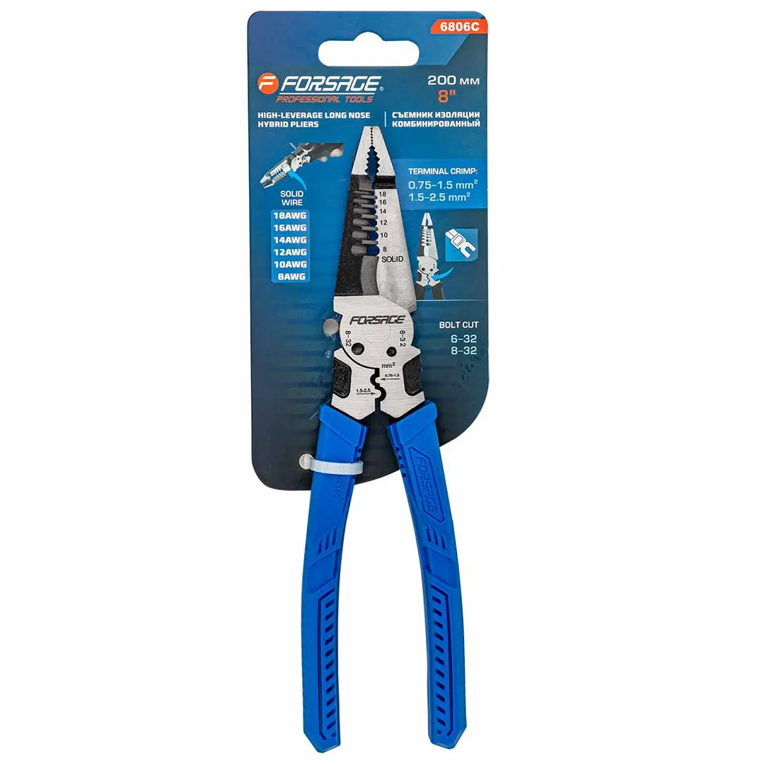 Сьёмник изоляции 200мм с эргономичными рукоятками могут использоваться для работы с проводами, кабелями и.т.д. Съёмник имеет удобные прорезиненные рукоятки, которые обеспечивают комфортный захват и предотвращают скольжение во время работы.Сьёмник предназначен для сьема изоляции сечения проводов диаметров 1-1,3-1,6-2-2,6мм (18-16-14-12-10AWG). Для этого в сьемнике предусмотрены специальные ложбины для провода, которые обеспечивают удобство работы. также обладает функцией зажима клемм 0,75-1,5мм² и 1,5-2,5мм² и специальными отверстиями для перекусывания гвоздей, проволоки и т.д. Кроме этого, благодаря рифлению на внутренней поверхности сьемник может использоваться в качестве плоскогубцев для захвата, манипулирования, удержания и поворота различных объектов и материалов. А благодаря закруглённому концу сьемник можно применять в качестве плоскогубцев в труднодоступных местах для более тонких работ.