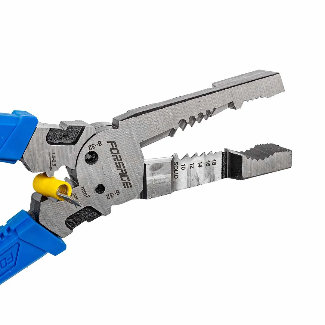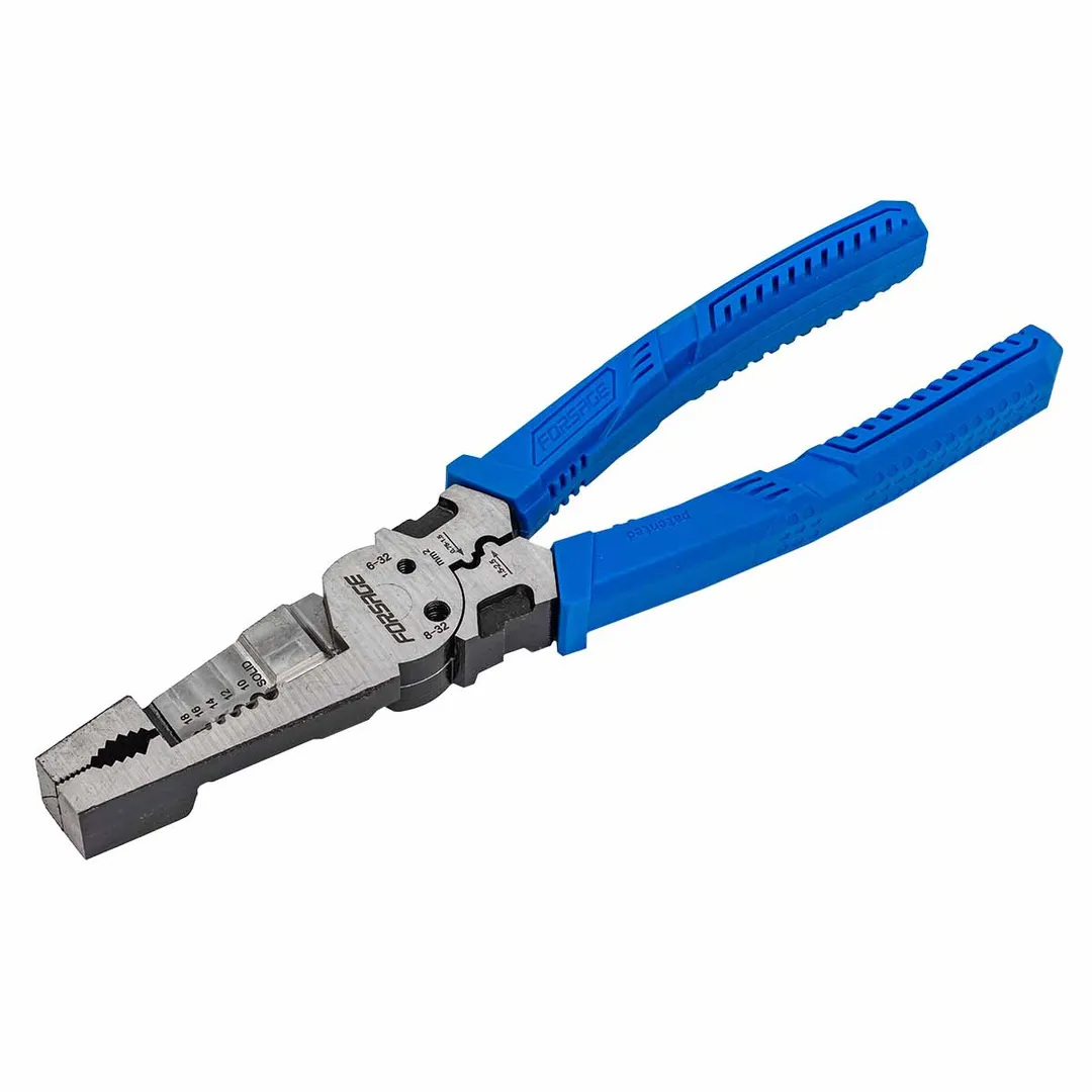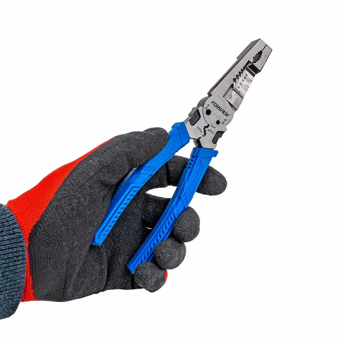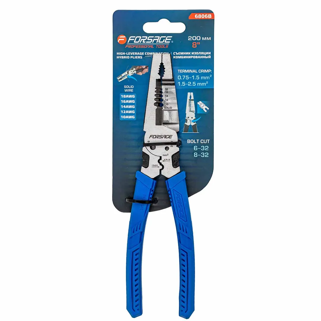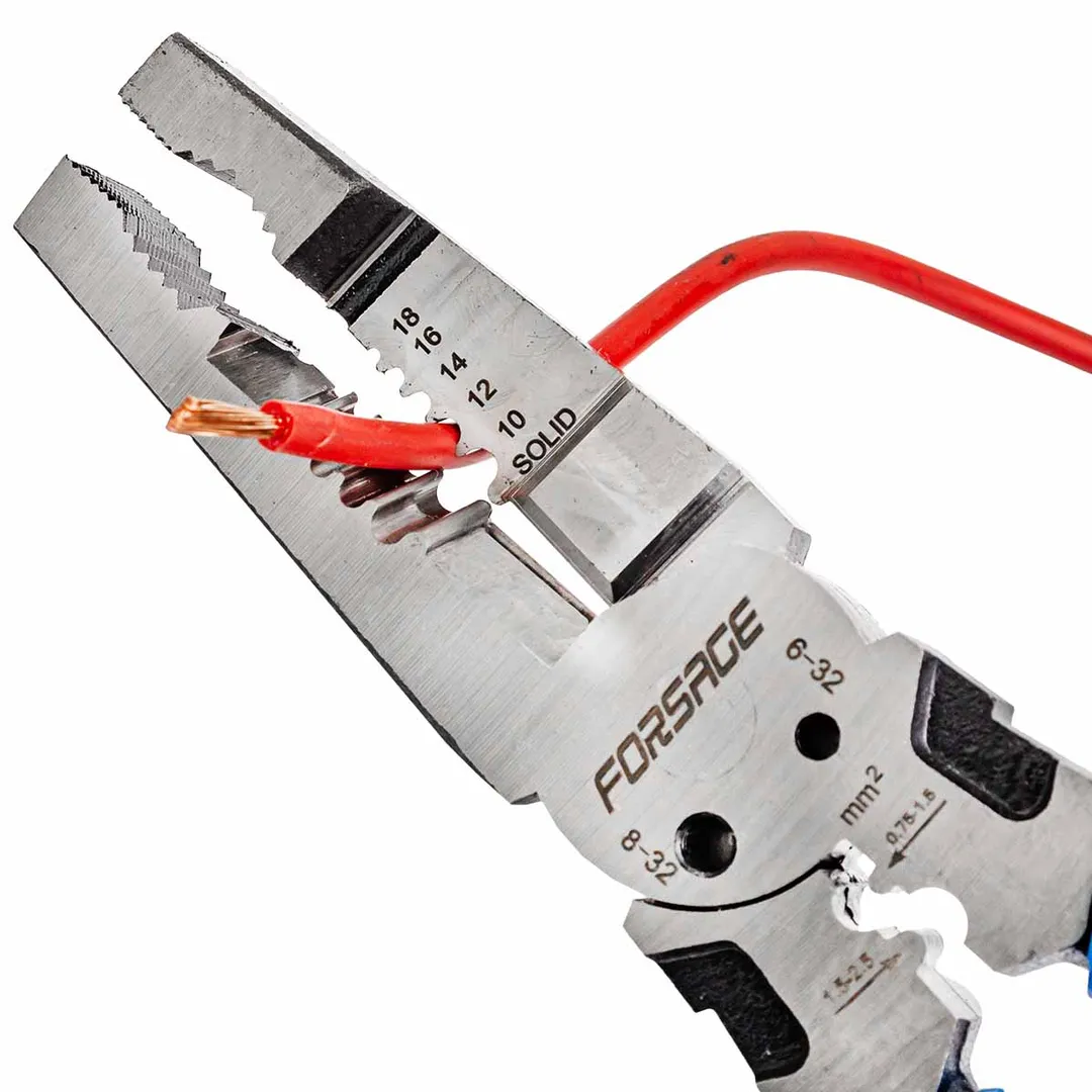 Сьёмник изоляции 200мм с эргономичными рукоятками могут использоваться для работы с проводами, кабелями и.т.д. Съёмник имеет удобные прорезиненные рукоятки, которые обеспечивают комфортный захват и предотвращают скольжение во время работы.Сьёмник предназначен для сьема изоляции сечения проводов диаметров 1-1,3-1,6-2-2,6мм (18-16-14-12-10AWG). Для этого в сьемнике предусмотрены специальные ложбины для провода, которые обеспечивают удобство работы. также обладает функцией зажима клемм 0,75-1,5мм² и 1,5-2,5мм² и специальными отверстиями для перекусывания гвоздей, проволоки и т.д. Кроме этого, благодаря рифлению на внутренней поверхности сьемник может использоваться в качестве плоскогубцев для захвата, манипулирования, удержания и поворота различных объектов и материалов.