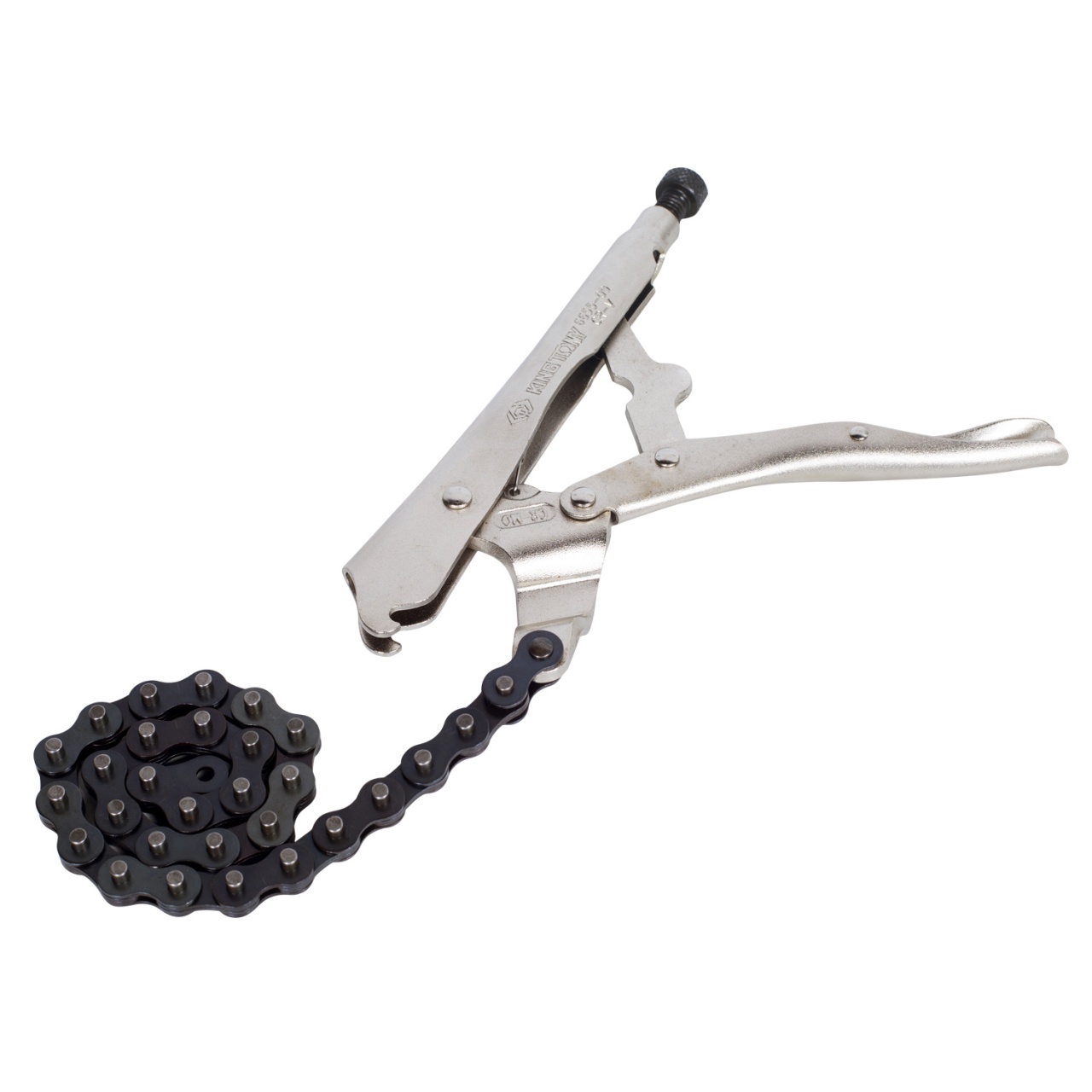 Зажим с фиксатором и цепным захватом предназначен для крепкого захвата и удержания различных элементов. в частности труб.