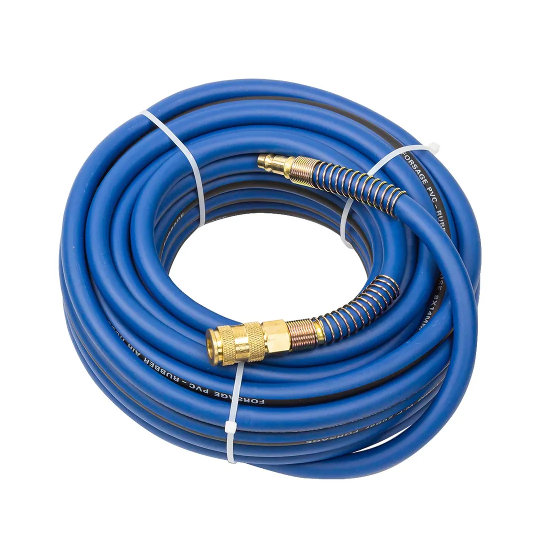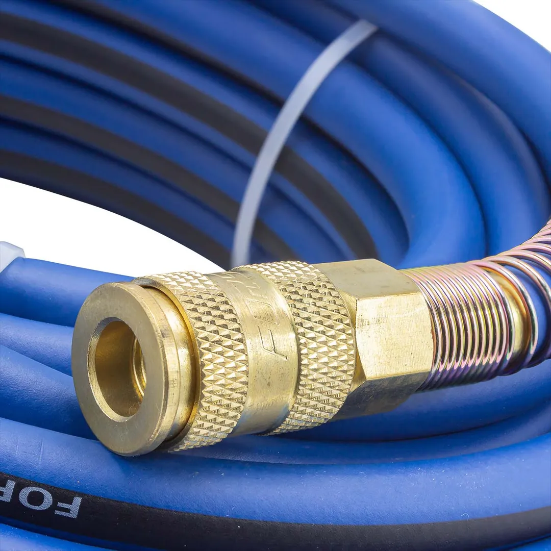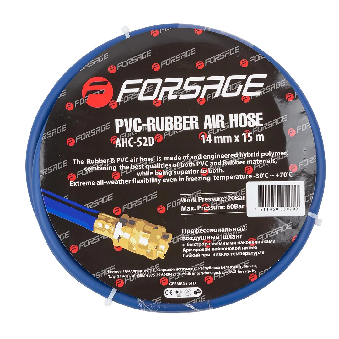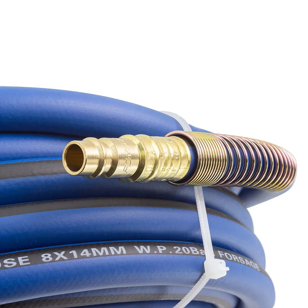 Шланг для компрессора резиновый воздушный армированный с фитингами 8 мм x 14 мм 15 м используется для подключения пневмоинструмента к компрессору при работе с сжатым воздухом. Воздушный шланг произведен из армированной резины, устойчивой к изнашиванию. Полимерная оболочка выдерживает многократное применение без разрывов, за счет чего обеспечиваются герметичность и длительная эксплуатация. Пневмошланг высокого давления оснащен дополнительной защитой в виде стальных пружин, которые предотвращают изламывание шланга в местах крепления, внутренний диаметр 8 мм и внешний диаметр 14 мм. Также благодаря армированию изделие выдерживает высокие нагрузки по давлению сжатого воздуха до 60 бар, рабочее давление 20 бар. Толщина стенки шланга составляет 3 мм, что придает ему высокую механическую прочность и долговечность. Быстросъемы изготовлены из латуни, устойчивые к коррозии и деформации. Соединение муфт обеспечивает удобство и долговечность эксплуатации. Область фиксации креплений усилена, что позволяет избежать перегиб