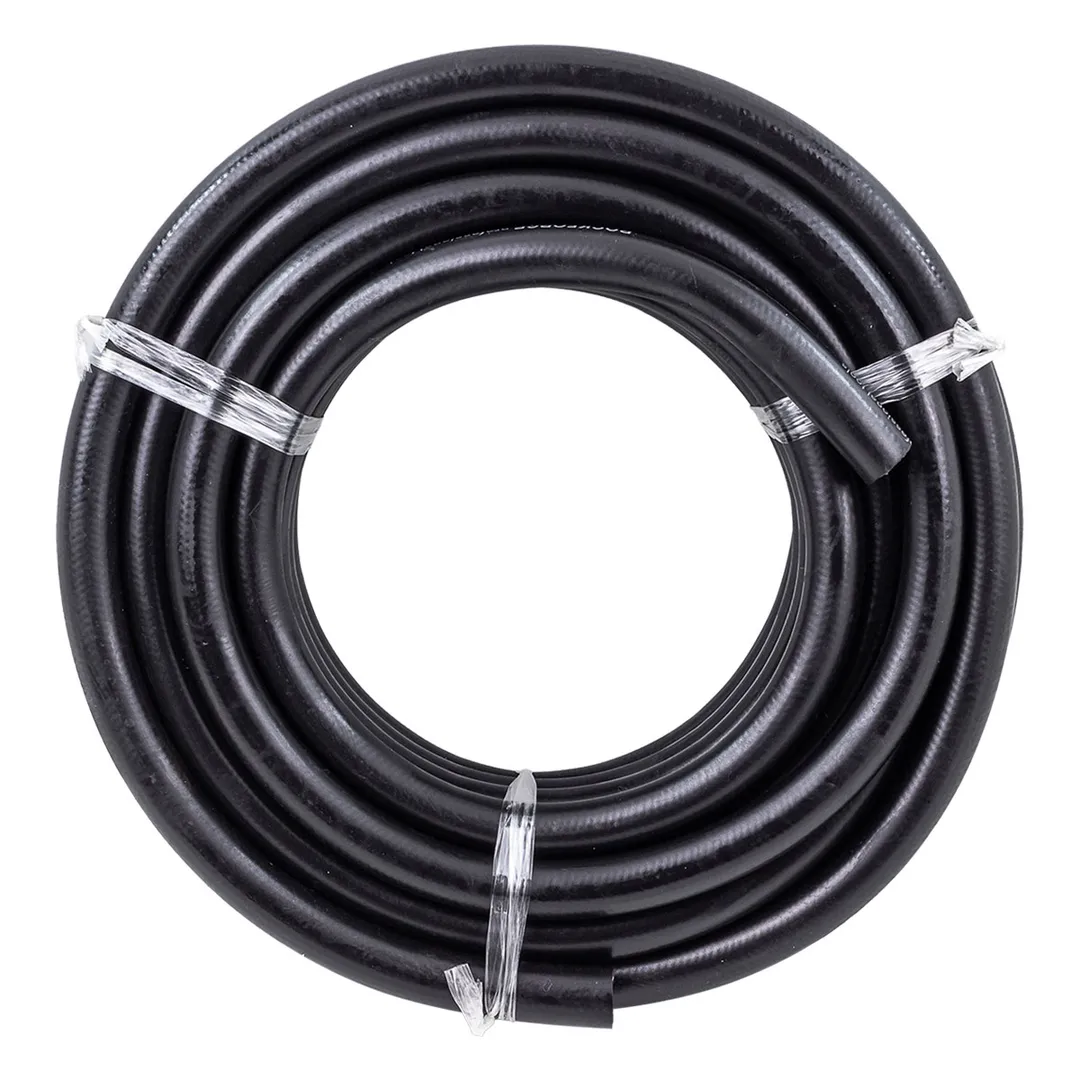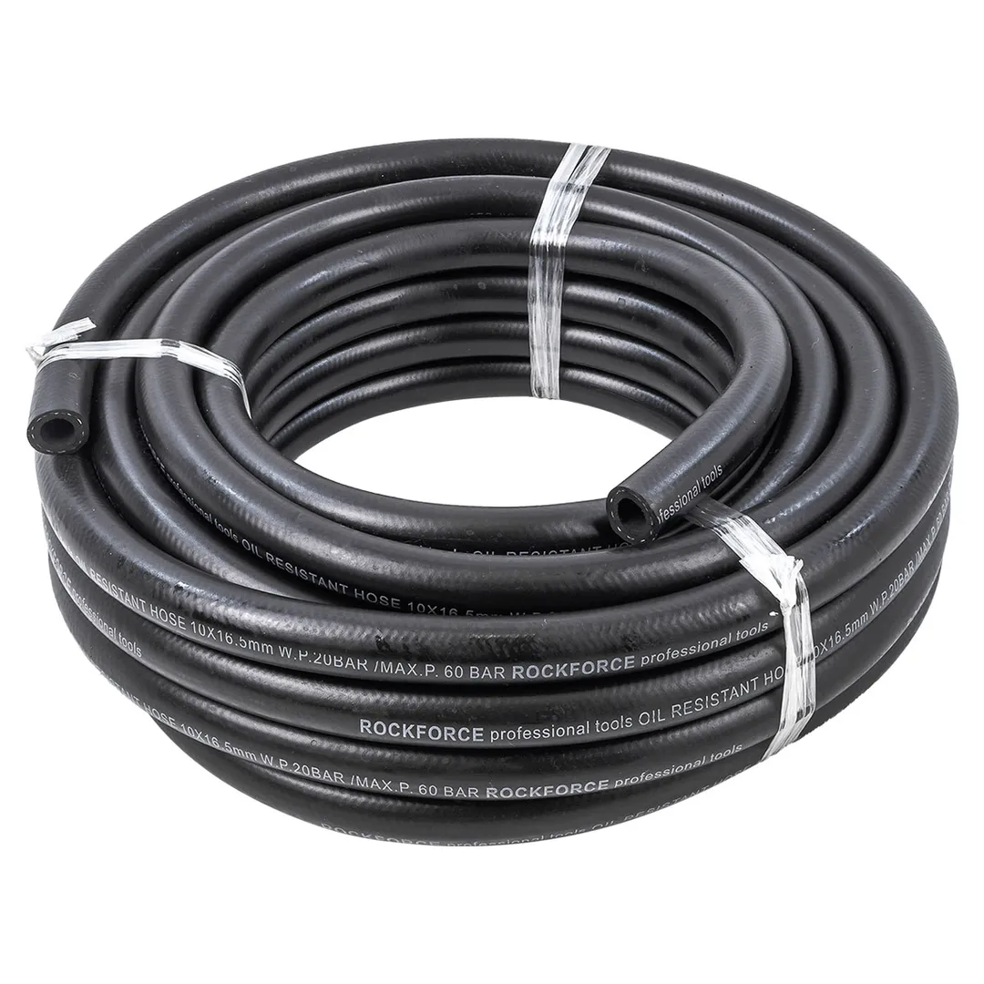 Шланг резиновый армированный бензо-маслостойкий, размером 10 х 16,5 мм и длиной 10 метров, обладает повышенной гибкостью и сопротивлением к излому. Армирован нейлоновой нитью. Этот шланг предназначен для использования в условиях, где требуется перенос бензина, масла или других нефтепродуктов. Шланг имеет рабочее давление до 20 бар и максимальное давление до 60 бар. Гибкий при низких температурах. Он способен выдерживать температуры от -30°C до +70°C, что делает его пригодным для использования в широком диапазоне климатических условий. Данный шланг соответствует стандарту DIN20018, что подтверждает его высокое качество и соответствие нормам безопасности.