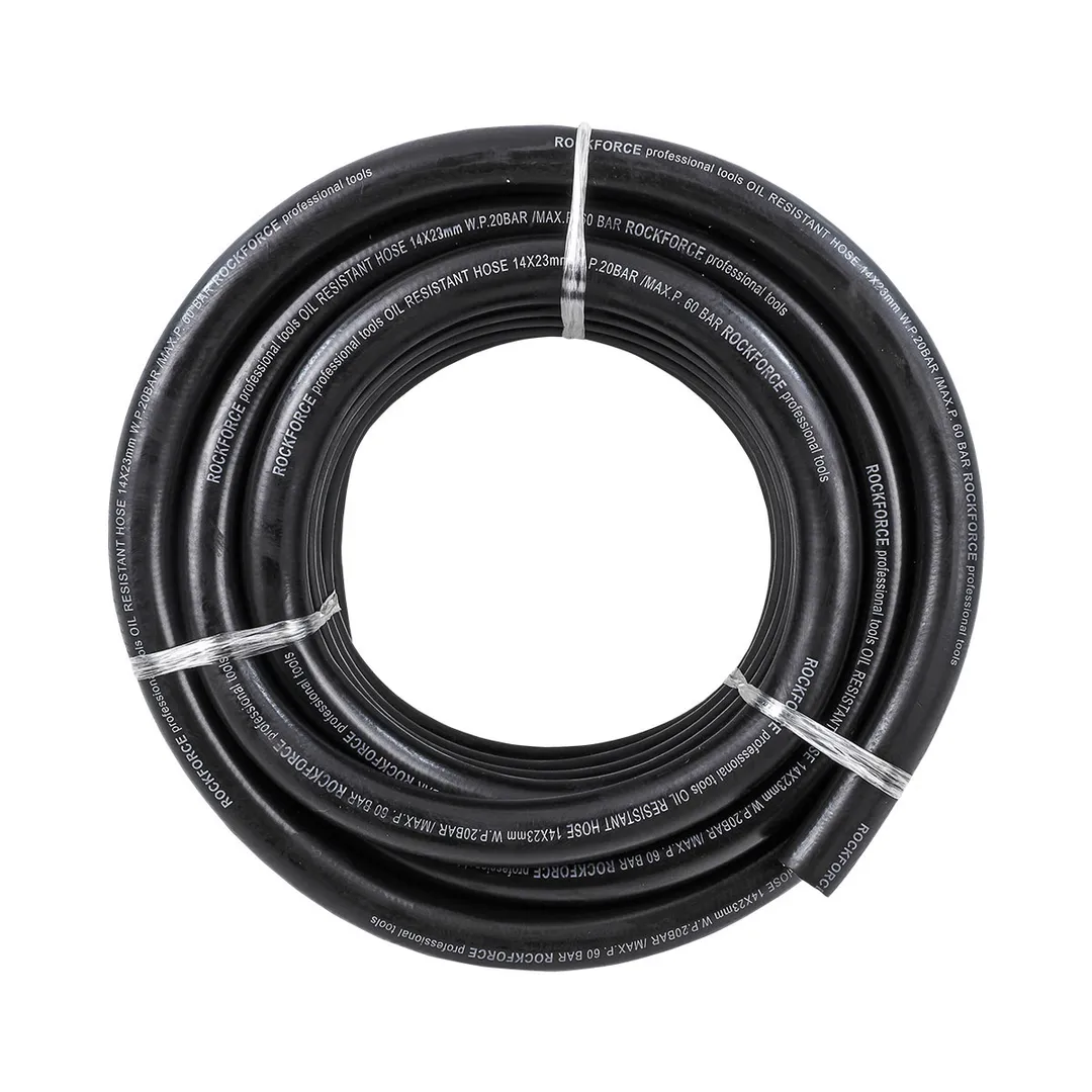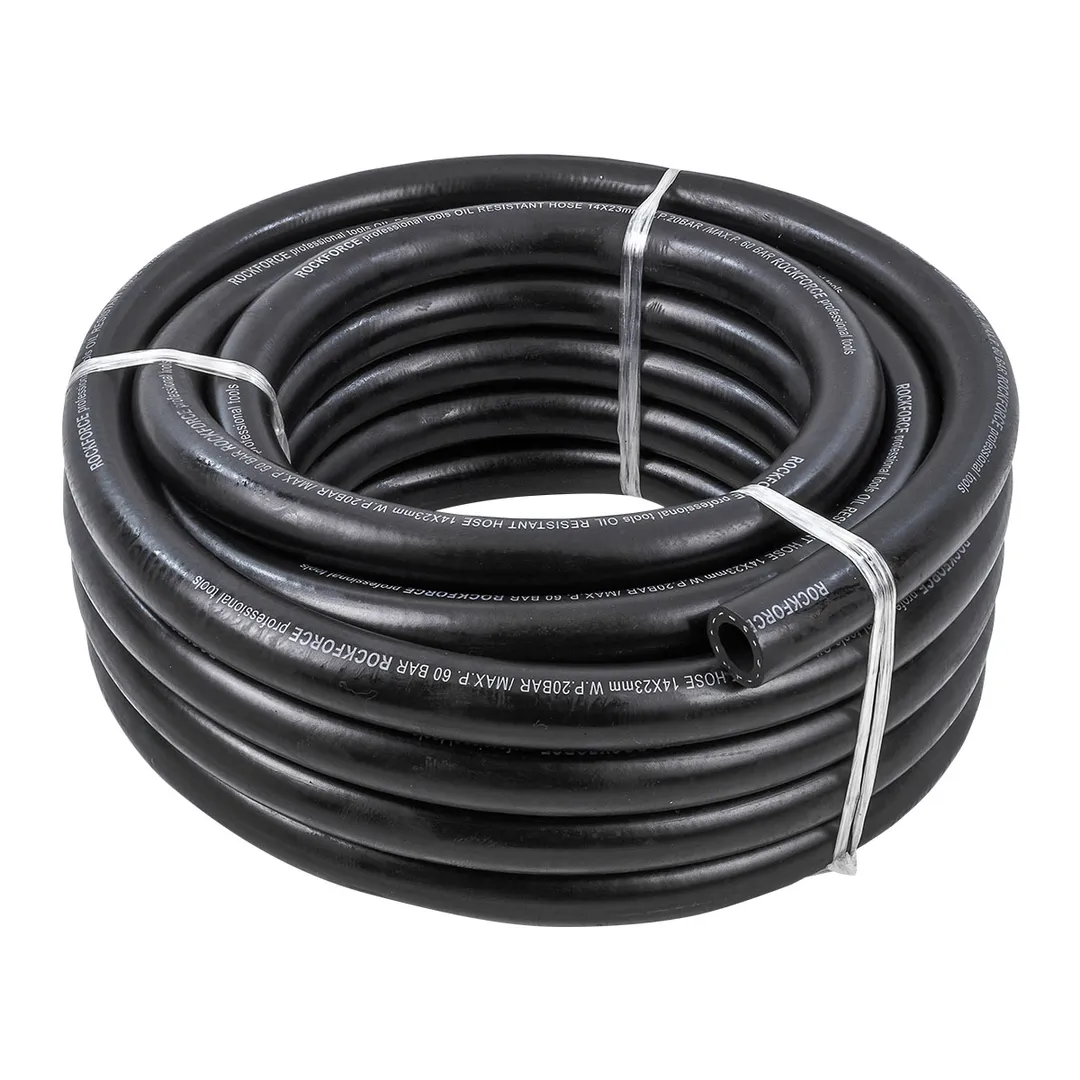 Шланг резиновый армированный бензо-маслостойкий, размером 14 х 23 мм и длиной 10 метров, обладает повышенной гибкостью и сопротивлением к излому. Армирован нейлоновой нитью. Этот шланг предназначен для использования в условиях, где требуется перенос бензина, масла или других нефтепродуктов. Шланг имеет рабочее давление до 20 бар и максимальное давление до 60 бар. Гибкий при низких температурах. Он способен выдерживать температуры от -30°C до +70°C, что делает его пригодным для использования в широком диапазоне климатических условий. Данный шланг соответствует стандарту DIN20018, что подтверждает его высокое качество и соответствие нормам безопасности.