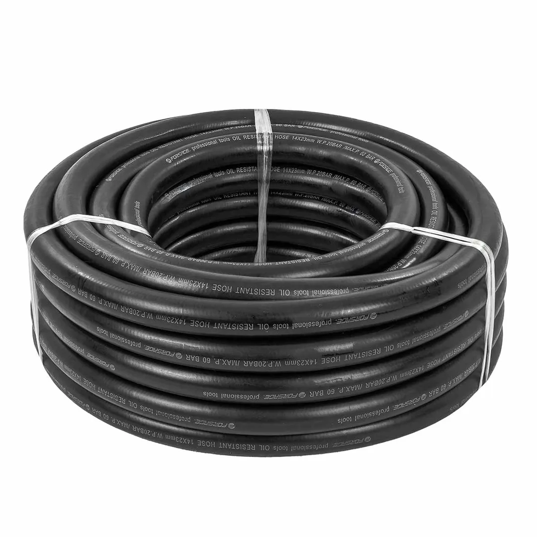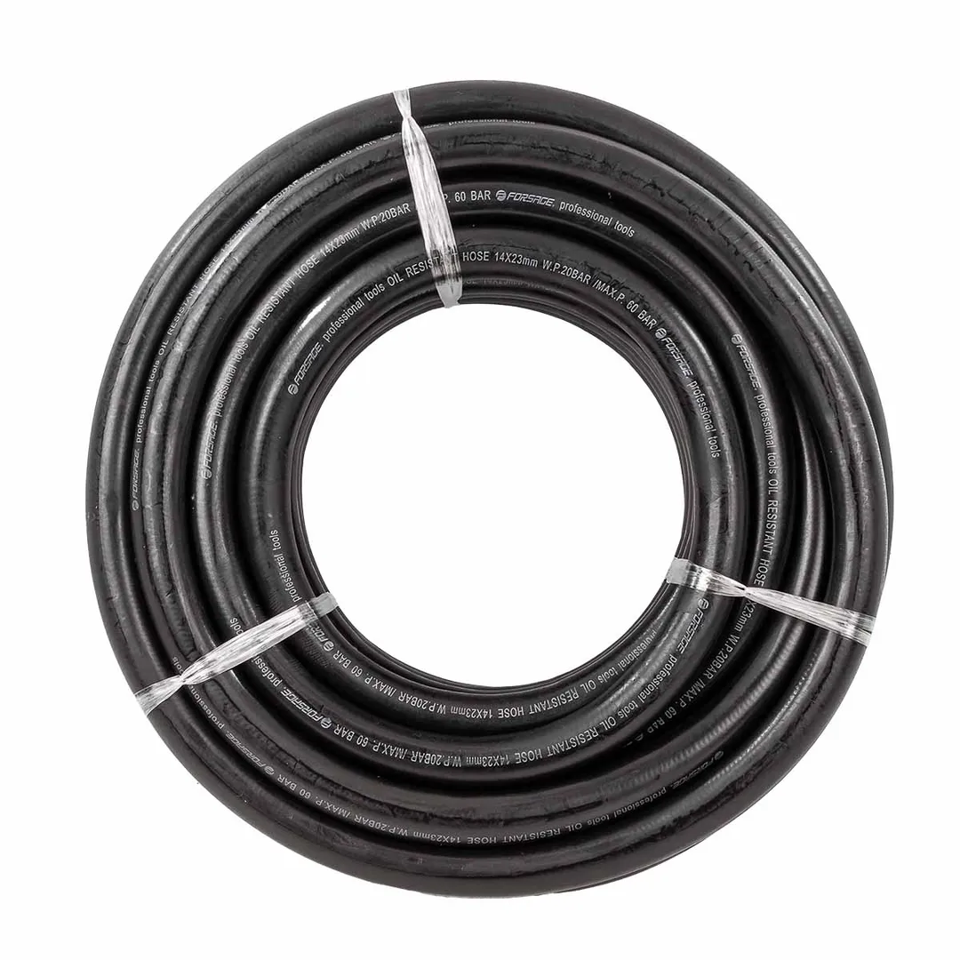 Шланг резиновый армированный бензо-маслостойкий, размером 14 х 23 мм и длиной 15 метров, обладает повышенной гибкостью и сопротивлением к излому. Армирован нейлоновой нитью. Этот шланг предназначен для использования в условиях, где требуется перенос бензина, масла или других нефтепродуктов. Шланг имеет рабочее давление до 20 бар и максимальное давление до 60 бар. Гибкий при низких температурах. Он способен выдерживать температуры от -30°C до +70°C, что делает его пригодным для использования в широком диапазоне климатических условий. Данный шланг соответствует стандарту DIN20018, что подтверждает его высокое качество и соответствие нормам безопасности.