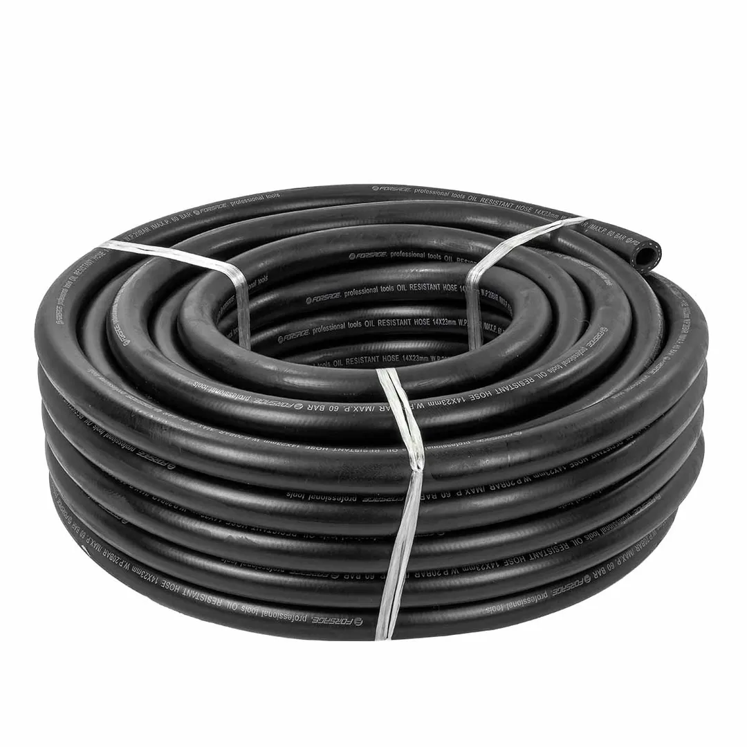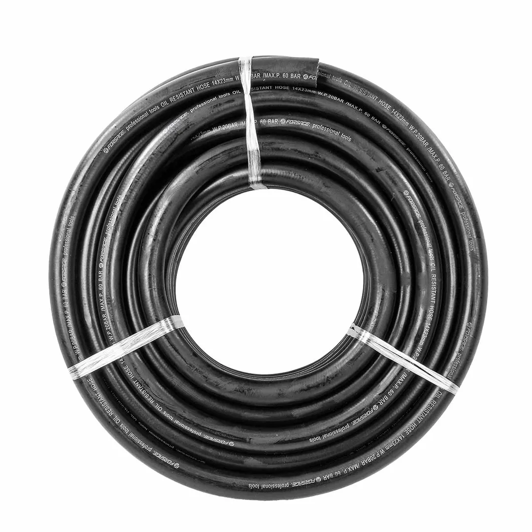 Шланг резиновый армированный бензо-маслостойкий, размером 14 х 23 мм и длиной 20 метров, обладает повышенной гибкостью и сопротивлением к излому. Армирован нейлоновой нитью. Этот шланг предназначен для использования в условиях, где требуется перенос бензина, масла или других нефтепродуктов. Шланг имеет рабочее давление до 20 бар и максимальное давление до 60 бар. Гибкий при низких температурах. Он способен выдерживать температуры от -30°C до +70°C, что делает его пригодным для использования в широком диапазоне климатических условий. Данный шланг соответствует стандарту DIN20018, что подтверждает его высокое качество и соответствие нормам безопасности.
