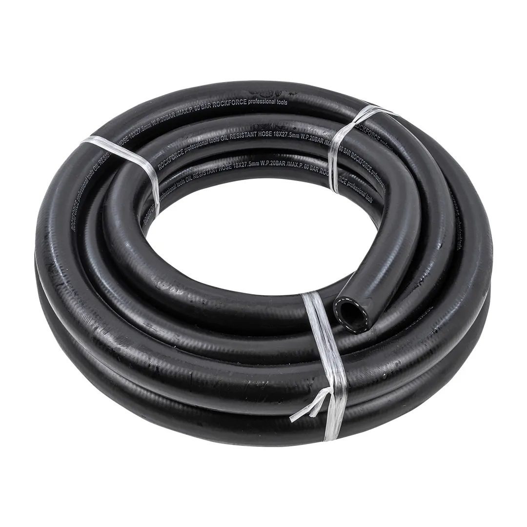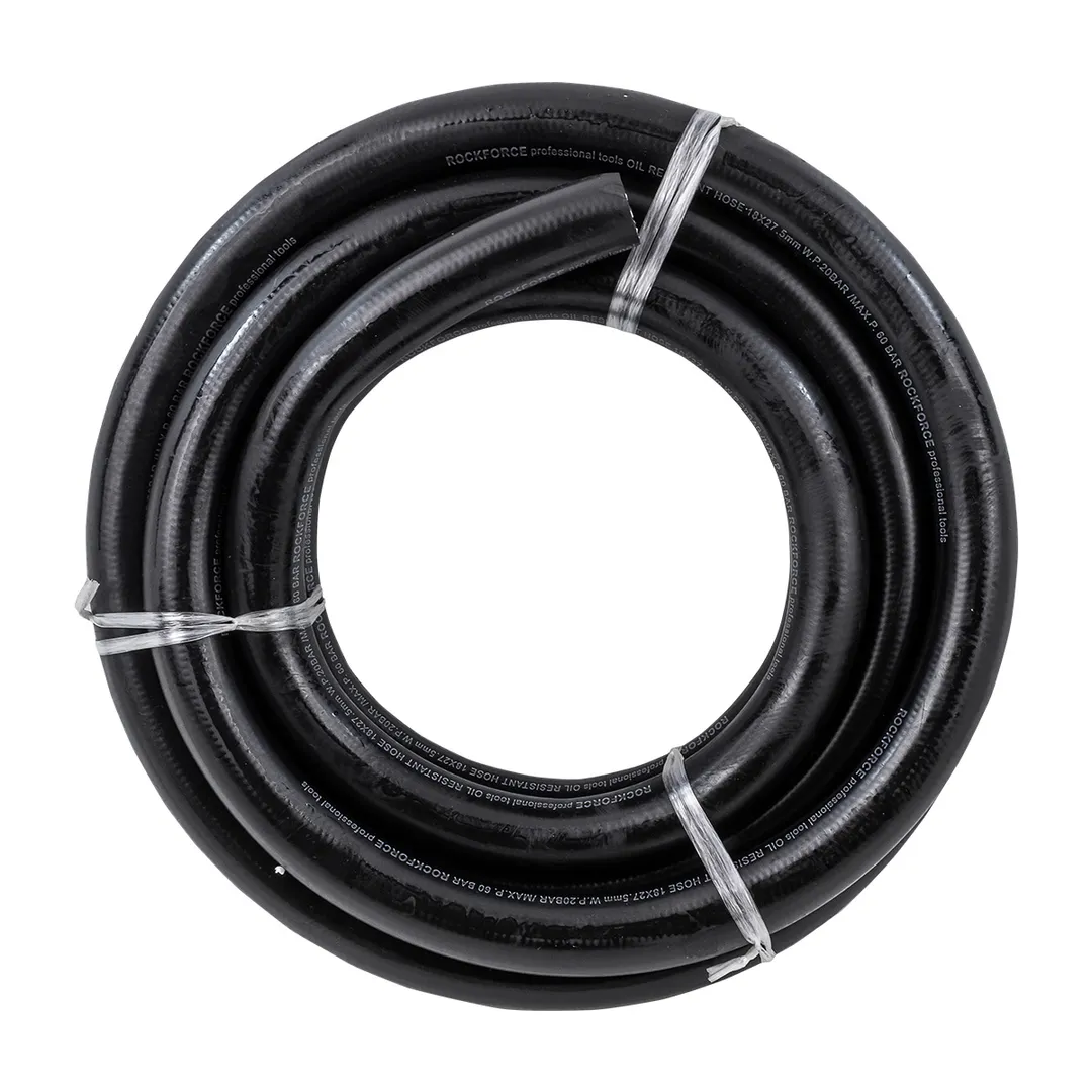 Шланг резиновый армированный бензо-маслостойкий, размером 18 х 27.5 мм и длиной 5 метров, обладает повышенной гибкостью и сопротивлением к излому. Армирован нейлоновой нитью. Этот шланг предназначен для использования в условиях, где требуется перенос бензина, масла или других нефтепродуктов. Шланг имеет рабочее давление до 20 бар и максимальное давление до 60 бар. Гибкий при низких температурах. Он способен выдерживать температуры от -30°C до +70°C, что делает его пригодным для использования в широком диапазоне климатических условий. Данный шланг соответствует стандарту DIN20018, что подтверждает его высокое качество и соответствие нормам безопасности.