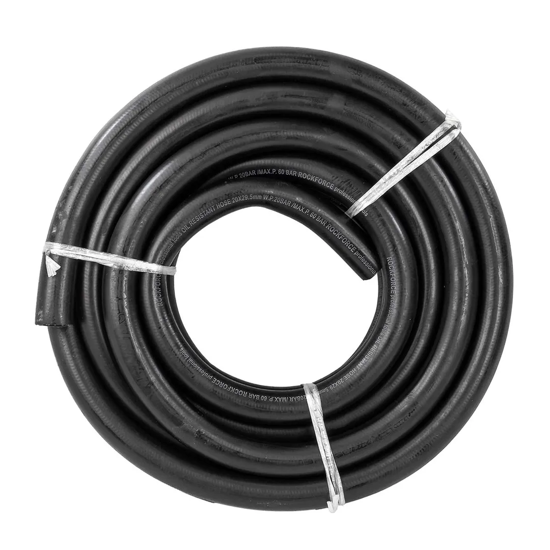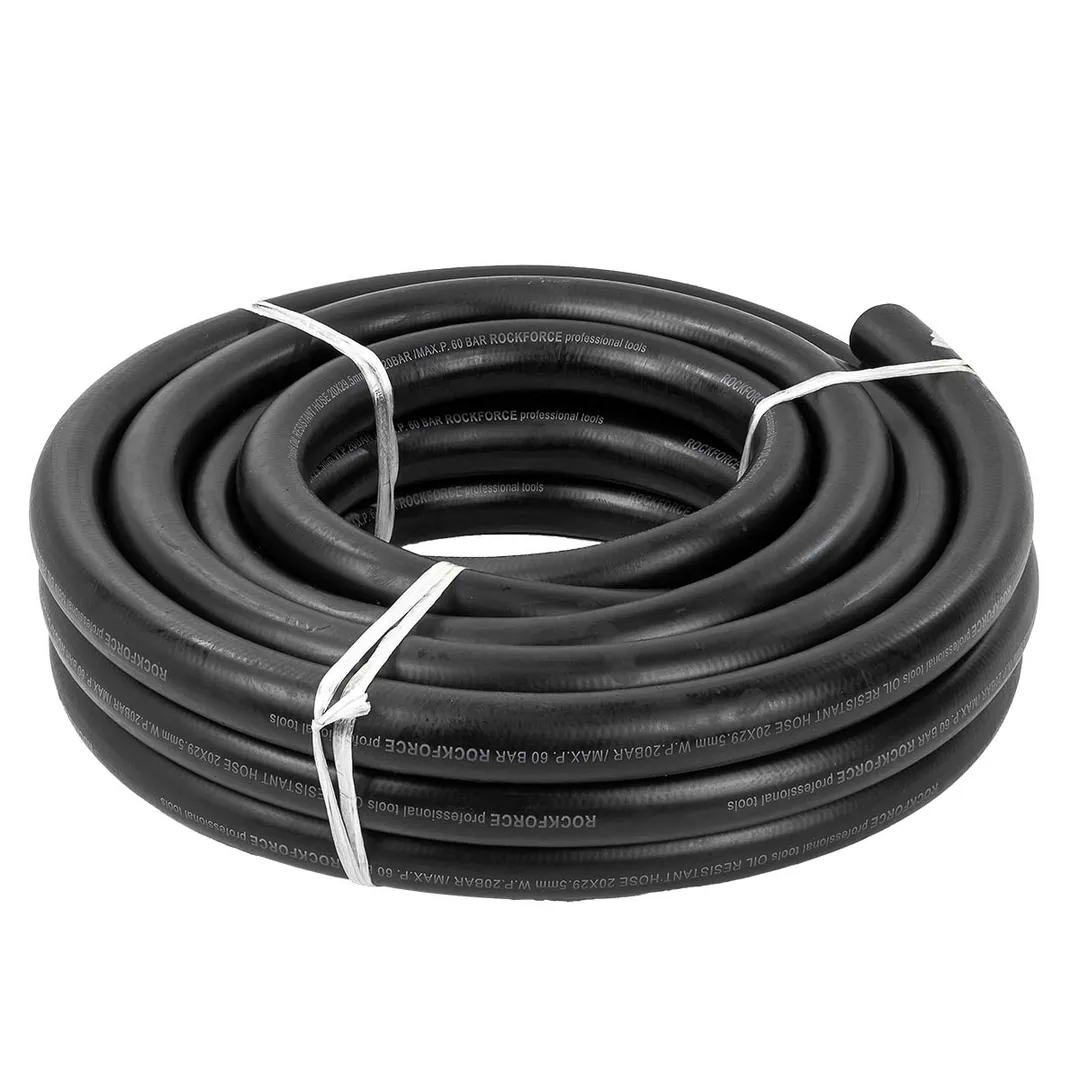 Шланг резиновый армированный бензо-маслостойкий, размером 20 х 29.5 мм и длиной 10 метров, обладает повышенной гибкостью и сопротивлением к излому. Армирован нейлоновой нитью. Этот шланг предназначен для использования в условиях, где требуется перенос бензина, масла или других нефтепродуктов. Шланг имеет рабочее давление до 20 бар и максимальное давление до 60 бар. Гибкий при низких температурах. Он способен выдерживать температуры от -30°C до +70°C, что делает его пригодным для использования в широком диапазоне климатических условий. Данный шланг соответствует стандарту DIN20018, что подтверждает его высокое качество и соответствие нормам безопасности.