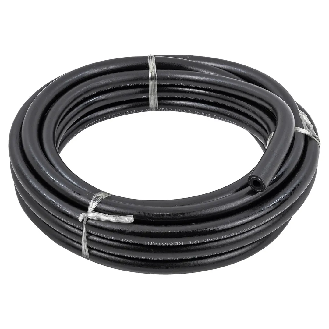 Шланг резиновый армированный бензо-маслостойкий, размером 5 х 12 мм и длиной 5 метров, обладает повышенной гибкостью и сопротивлением к излому. Армирован нейлоновой нитью. Этот шланг предназначен для использования в условиях, где требуется перенос бензина, масла или других нефтепродуктов. Шланг имеет рабочее давление до 20 бар и максимальное давление до 60 бар. Гибкий при низких температурах. Он способен выдерживать температуры от -30°C до +70°C, что делает его пригодным для использования в широком диапазоне климатических условий. Данный шланг соответствует стандарту DIN20018, что подтверждает его высокое качество и соответствие нормам безопасности.