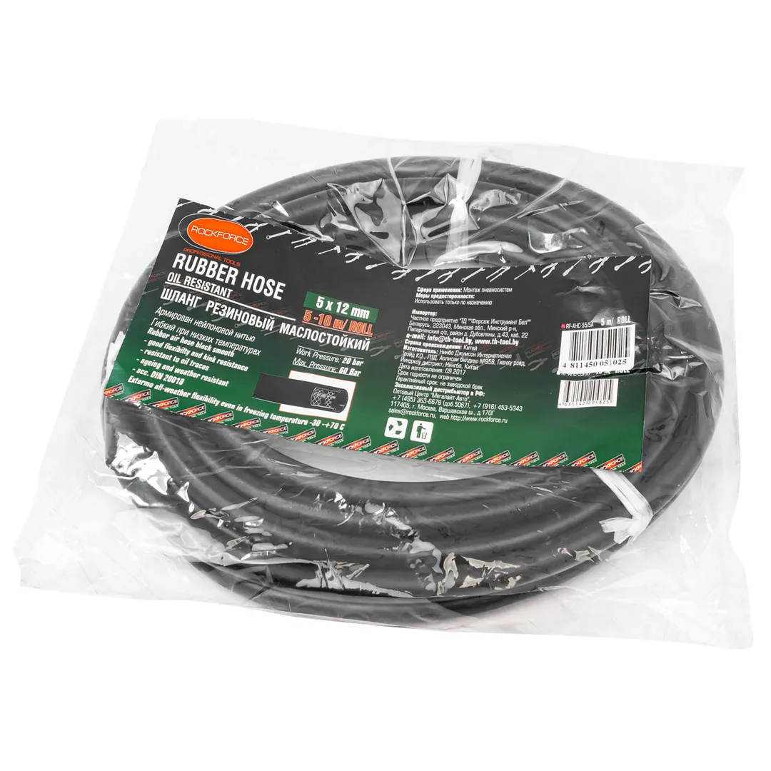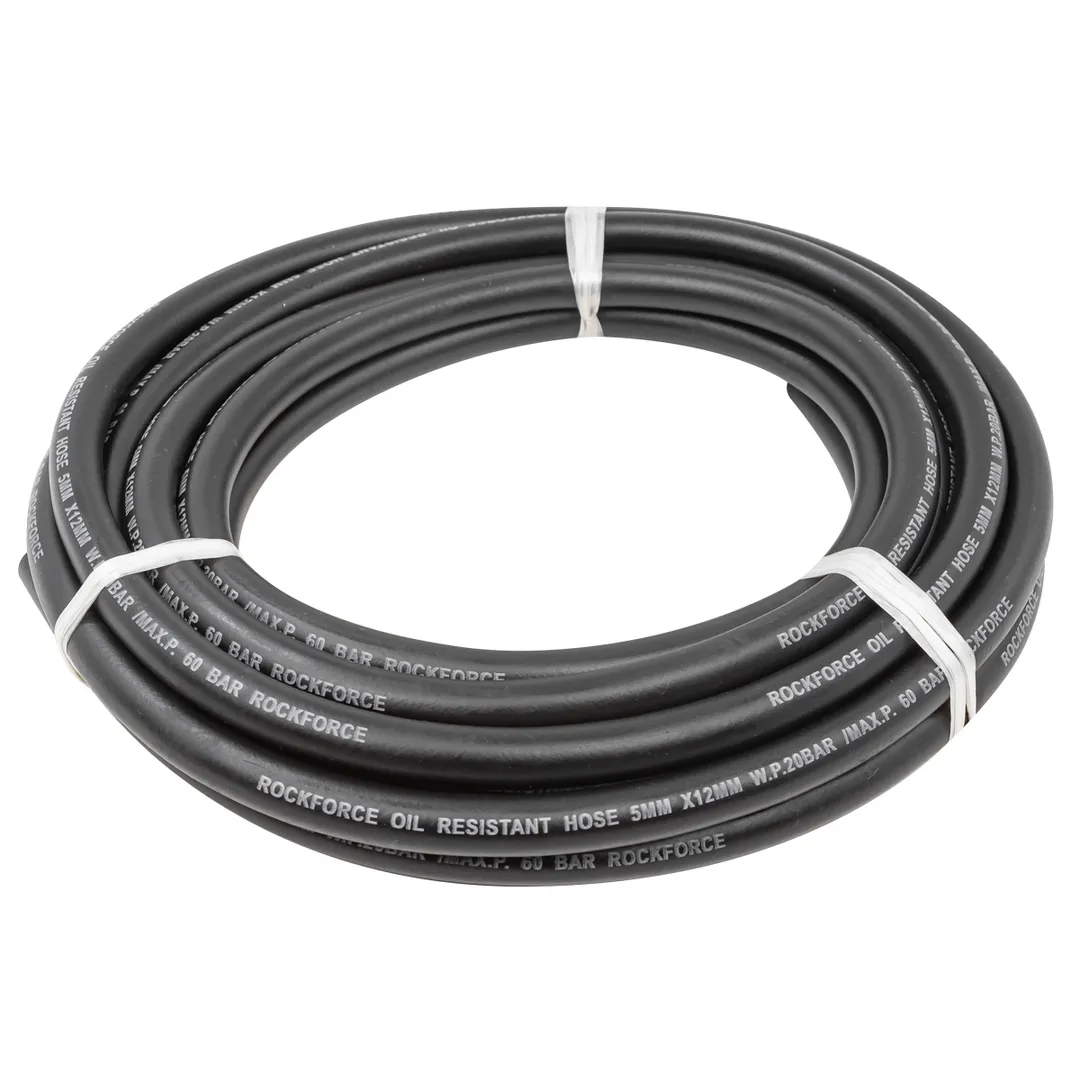 Шланг резиновый армированный бензо-маслостойкий, размером 5 х 12 мм и длиной 5 метров, обладает повышенной гибкостью и сопротивлением к излому. Армирован нейлоновой нитью. Этот шланг предназначен для использования в условиях, где требуется перенос бензина, масла или других нефтепродуктов. Шланг имеет рабочее давление до 20 бар и максимальное давление до 60 бар. Гибкий при низких температурах. Он способен выдерживать температуры от -30°C до +70°C, что делает его пригодным для использования в широком диапазоне климатических условий. Данный шланг соответствует стандарту DIN20018, что подтверждает его высокое качество и соответствие нормам безопасности.