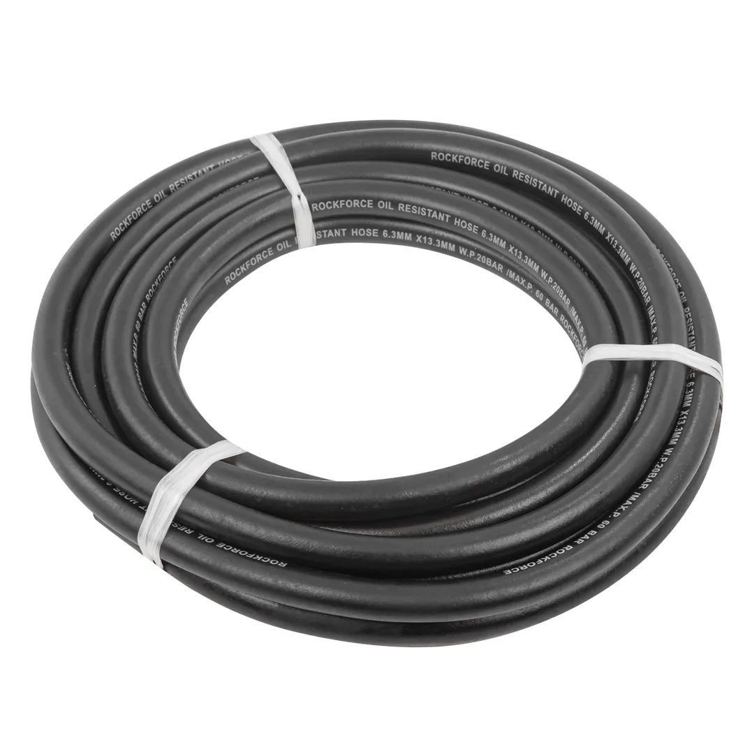 Шланг резиновый армированный бензо-маслостойкий, размером 6,3 х 13,3 мм и длиной 5 метров, обладает повышенной гибкостью и сопротивлением к излому. Армирован нейлоновой нитью. Этот шланг предназначен для использования в условиях, где требуется перенос бензина, масла или других нефтепродуктов. Шланг имеет рабочее давление до 20 бар и максимальное давление до 60 бар. Гибкий при низких температурах. Он способен выдерживать температуры от -30°C до +70°C, что делает его пригодным для использования в широком диапазоне климатических условий. Данный шланг соответствует стандарту DIN20018, что подтверждает его высокое качество и соответствие нормам безопасности.