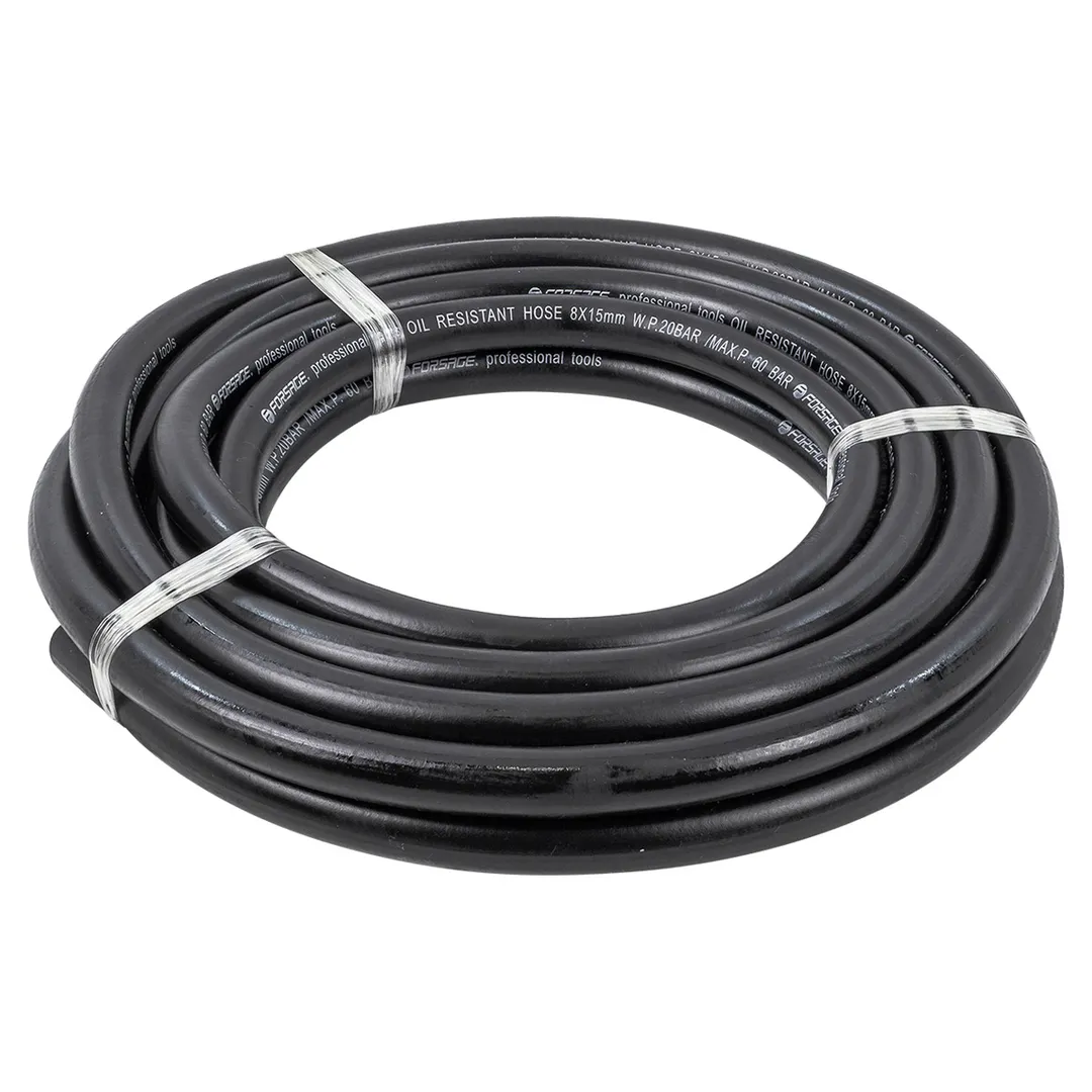 Шланг резиновый армированный бензо-маслостойкий, размером 8 х 15 мм и длиной 5 метров, обладает повышенной гибкостью и сопротивлением к излому. Армирован нейлоновой нитью. Этот шланг предназначен для использования в условиях, где требуется перенос бензина, масла или других нефтепродуктов. Шланг имеет рабочее давление до 20 бар и максимальное давление до 60 бар. Гибкий при низких температурах. Он способен выдерживать температуры от -30°C до +70°C, что делает его пригодным для использования в широком диапазоне климатических условий. Данный шланг соответствует стандарту DIN20018, что подтверждает его высокое качество и соответствие нормам безопасности.