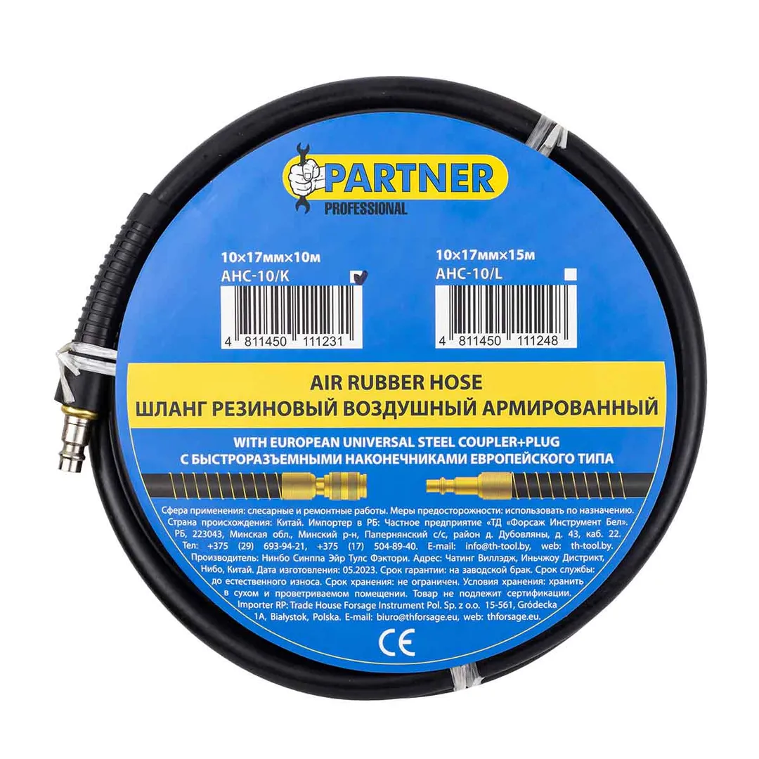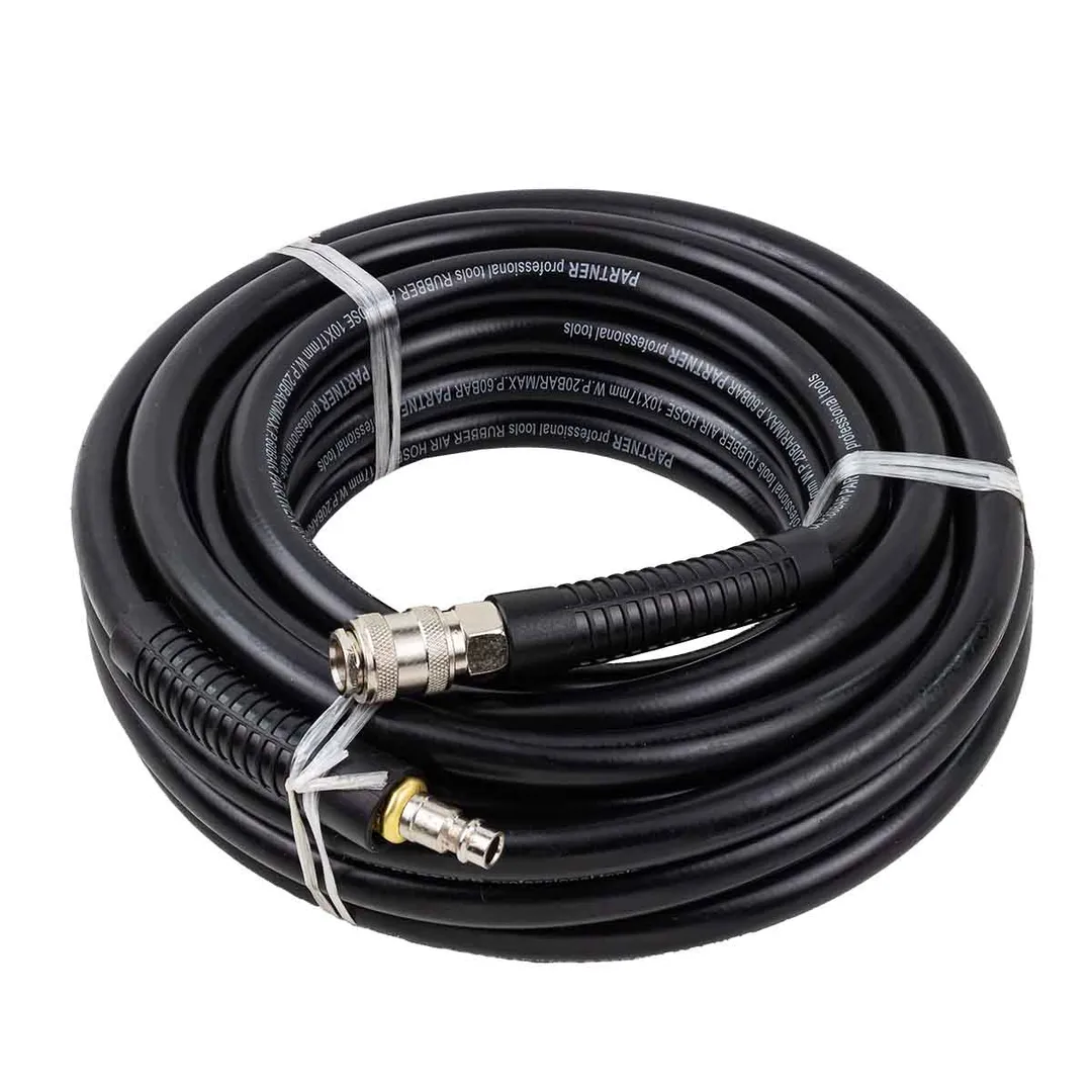 Шланг для компрессора резиновый воздушный армированный с фитингами 10 мм x 17 мм 10 м используется для подключения пневмоинструмента к компрессору при работе с сжатым воздухом. Воздушный шланг произведен из армированной резины, устойчивой к изнашиванию. Полимерная оболочка выдерживает многократное применение без разрывов, за счет чего обеспечиваются герметичность и длительная эксплуатация. Пневмошланг высокого давления оснащен дополнительной защитой в виде пластикового кожуха, который предотвращает изламывание шланга в местах крепления, внутренний диаметр 10 мм и внешний диаметр 17 мм. Также благодаря армированию изделие выдерживает высокие нагрузки по давлению сжатого воздуха до 60 бар, рабочее давление 20 бар. Толщина стенки шланга составляет 3,5 мм, что придает ему высокую механическую прочность и долговечность. Быстросъемы изготовлены из латуни, устойчивые к коррозии и деформации. Соединение муфт обеспечивает удобство и долговечность эксплуатации. Область фиксации креплений усилена, что позволяет избежать