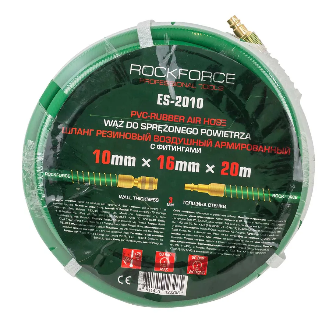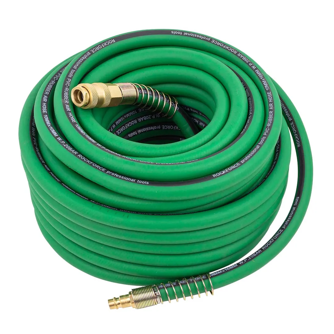Шланг для компрессора резиновый воздушный армированный с фитингами 10 мм x 16 мм 20 м используется для подключения пневмоинструмента к компрессору при работе с сжатым воздухом. Воздушный шланг произведен из армированной резины, устойчивой к изнашиванию. Полимерная оболочка выдерживает многократное применение без разрывов, за счет чего обеспечиваются герметичность и длительная эксплуатация. Пневмошланг высокого давления оснащен дополнительной защитой в виде стальных пружин, которые предотвращают изламывание шланга в местах крепления, внутренний диаметр 10 мм и внешний диаметр 16 мм. Также благодаря армированию изделие выдерживает высокие нагрузки по давлению сжатого воздуха до 50 бар, рабочее давление 20 бар. Толщина стенки шланга составляет 3 мм, что придает ему высокую механическую прочность и долговечность. Быстросъемы изготовлены из латуни, устойчивые к коррозии и деформации. Соединение муфт обеспечивает удобство и долговечность эксплуатации. Область фиксации креплений усилена, что позволяет избежать перег