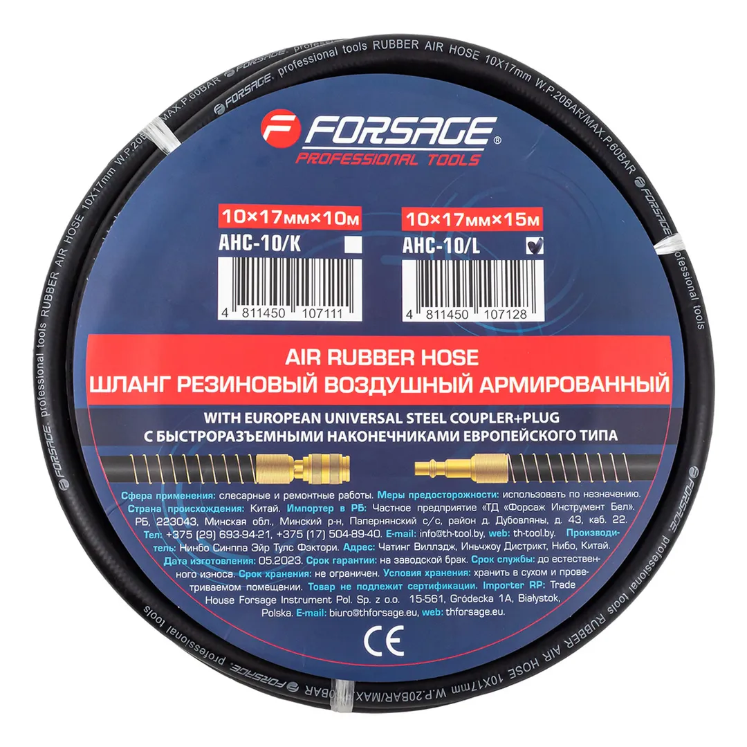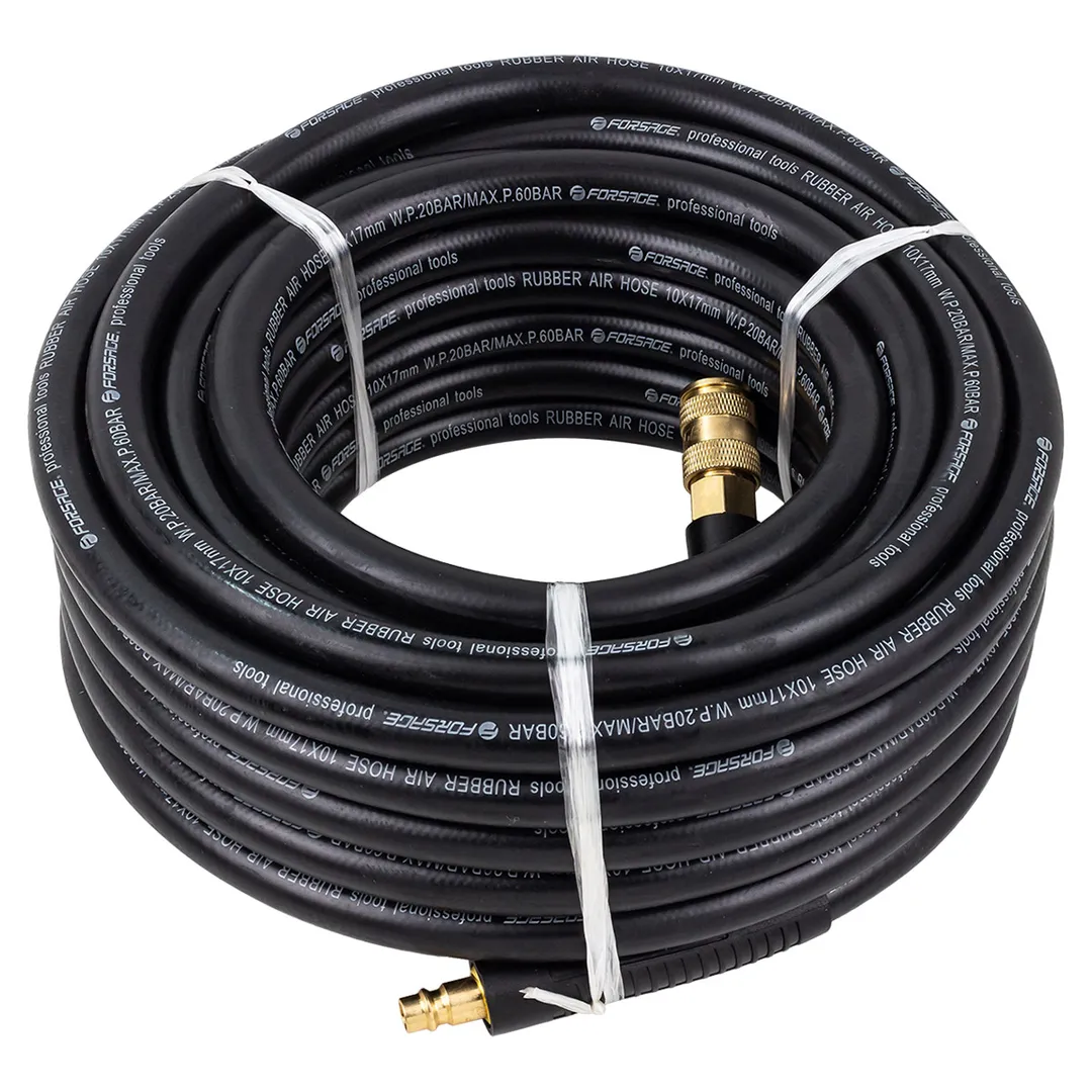 Шланг для компрессора резиновый воздушный армированный с фитингами 10 мм x 17 мм 15 м используется для подключения пневмоинструмента к компрессору при работе с сжатым воздухом. Воздушный шланг произведен из армированной резины, устойчивой к изнашиванию. Полимерная оболочка выдерживает многократное применение без разрывов, за счет чего обеспечиваются герметичность и длительная эксплуатация. Пневмошланг высокого давления оснащен дополнительной защитой в виде пластикового кожуха, который предотвращает изламывание шланга в местах крепления, внутренний диаметр 10 мм и внешний диаметр 17 мм. Также благодаря армированию изделие выдерживает высокие нагрузки по давлению сжатого воздуха до 60 бар, рабочее давление 20 бар. Толщина стенки шланга составляет 3,5 мм, что придает ему высокую механическую прочность и долговечность. Быстросъемы изготовлены из латуни, устойчивые к коррозии и деформации. Соединение муфт обеспечивает удобство и долговечность эксплуатации. Область фиксации креплений усилена, что позволяет избежать