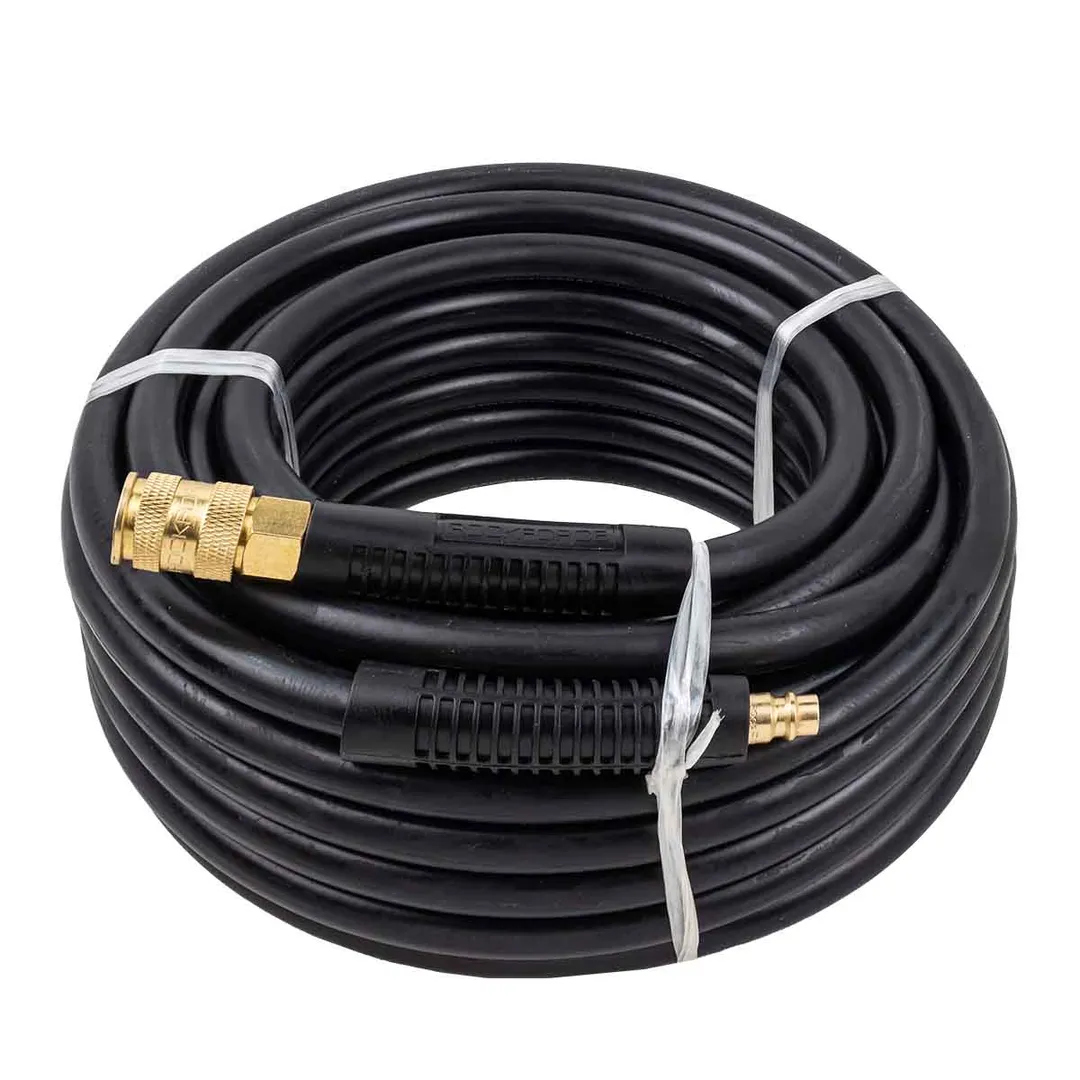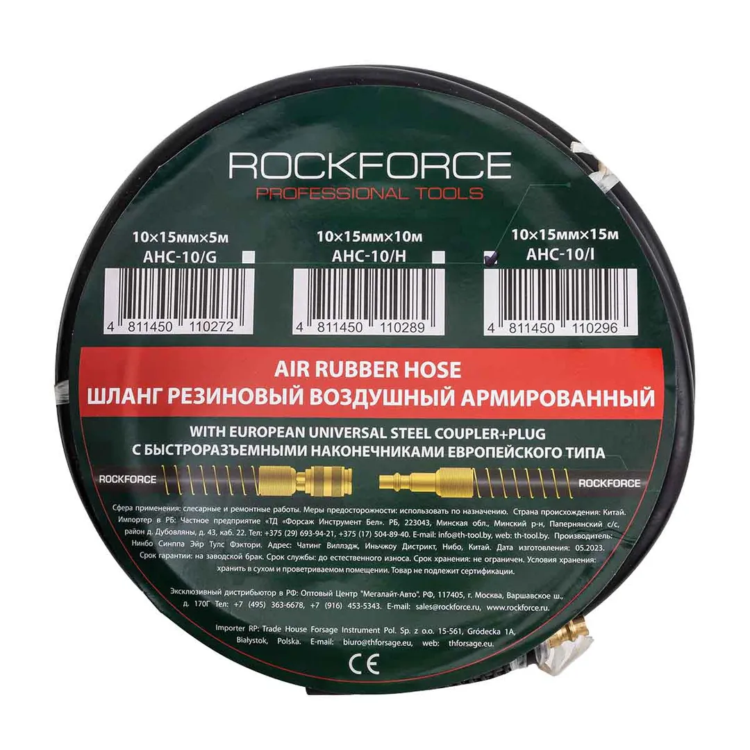 Шланг для компрессора резиновый воздушный армированный с фитингами 10 мм x 15 мм 15 м используется для подключения пневмоинструмента к компрессору при работе с сжатым воздухом. Воздушный шланг произведен из армированной резины, устойчивой к изнашиванию. Полимерная оболочка выдерживает многократное применение без разрывов, за счет чего обеспечиваются герметичность и длительная эксплуатация. Пневмошланг высокого давления оснащен дополнительной защитой в виде стальных пружин, которые предотвращают изламывание шланга в местах крепления, внутренний диаметр 10 мм и внешний диаметр 15 мм. Также благодаря армированию изделие выдерживает высокие нагрузки по давлению сжатого воздуха до 60 бар, рабочее давление 20 бар. Толщина стенки шланга составляет 2,5 мм, что придает ему высокую механическую прочность и долговечность. Быстросъемы изготовлены из латуни, устойчивые к коррозии и деформации. Соединение муфт обеспечивает удобство и долговечность эксплуатации. Область фиксации креплений усилена, что позволяет избежать пер