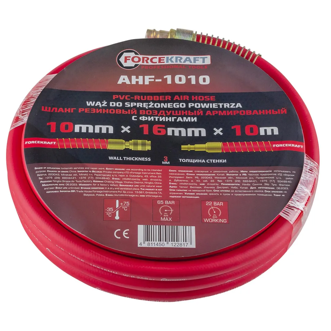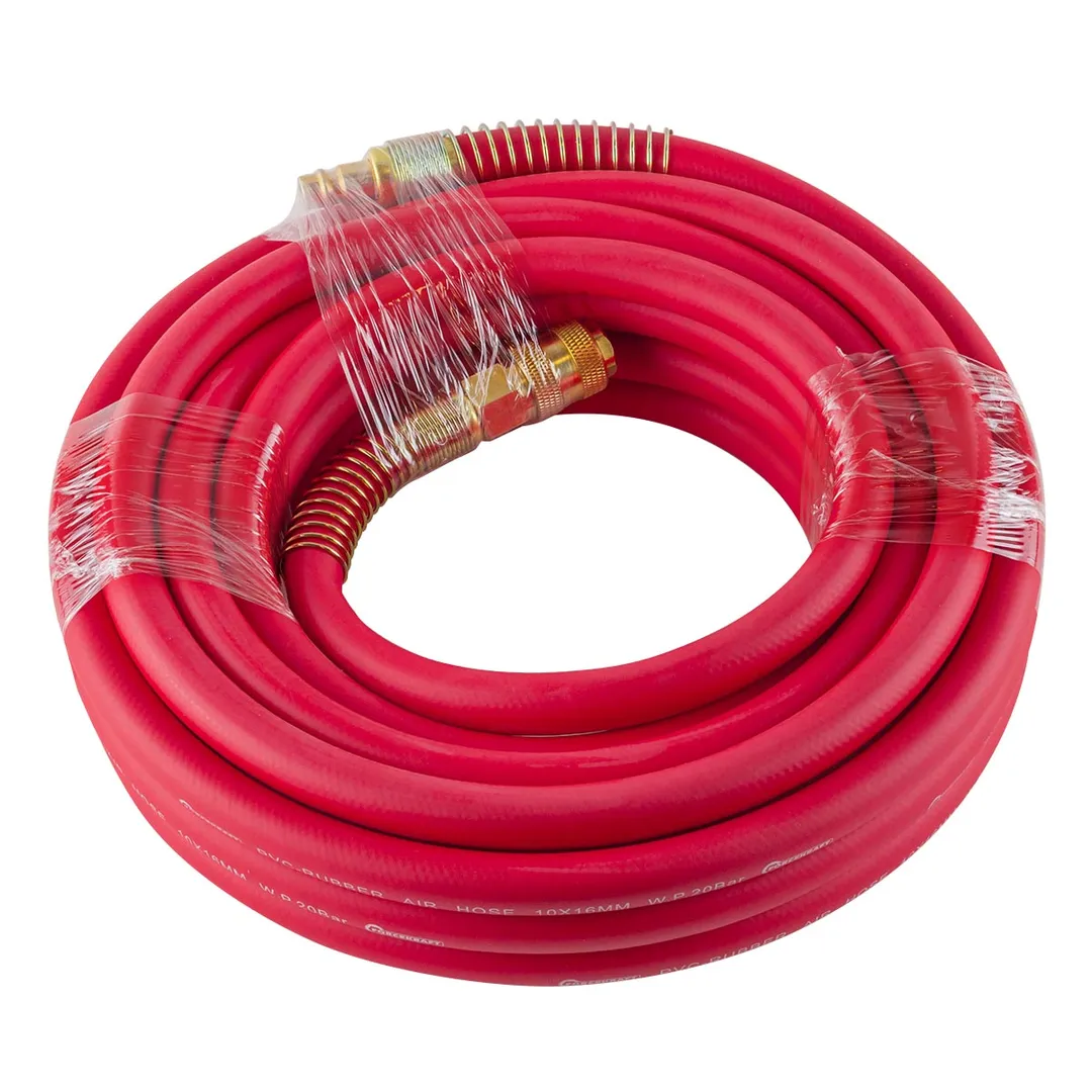 Шланг для компрессора резиновый воздушный армированный с фитингами 10 мм x 16 мм 10 м используется для подключения пневмоинструмента к компрессору при работе с сжатым воздухом. Воздушный шланг произведен из армированной резины, устойчивой к изнашиванию. Полимерная оболочка выдерживает многократное применение без разрывов, за счет чего обеспечиваются герметичность и длительная эксплуатация. Пневмошланг высокого давления оснащен дополнительной защитой в виде стальных пружин, которые предотвращают изламывание шланга в местах крепления, внутренний диаметр 10 мм и внешний диаметр 16 мм. Также благодаря армированию изделие выдерживает высокие нагрузки по давлению сжатого воздуха до 65 бар, рабочее давление 22 бар. Толщина стенки шланга составляет 3 мм, что придает ему высокую механическую прочность и долговечность. Быстросъемы изготовлены из латуни, устойчивые к коррозии и деформации. Соединение муфт обеспечивает удобство и долговечность эксплуатации. Область фиксации креплений усилена, что позволяет избежать перег