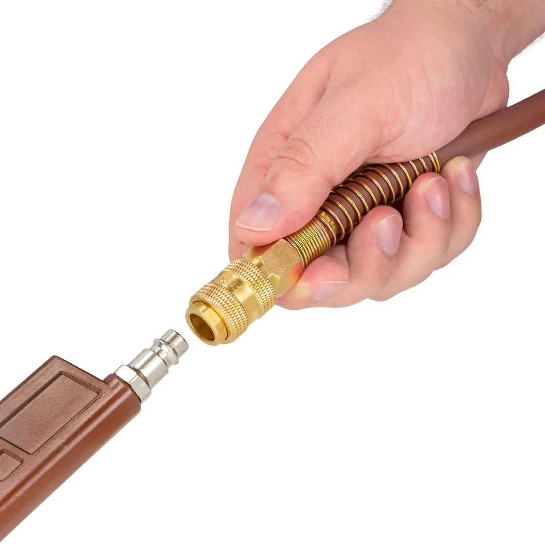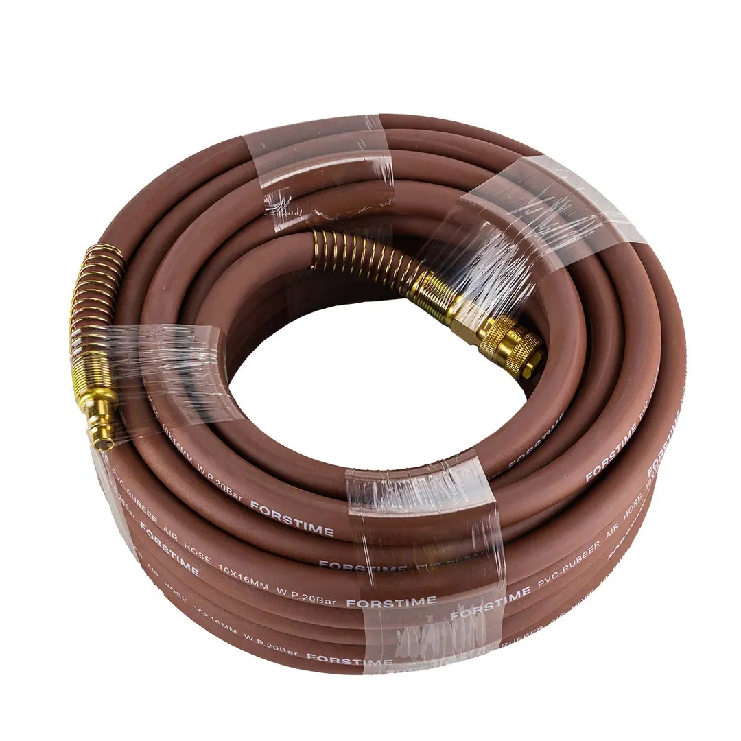 Шланг для компрессора резиновый воздушный армированный с фитингами 10 мм x 16 мм 15 м используется для подключения пневмоинструмента к компрессору при работе с сжатым воздухом. Воздушный шланг произведен из армированной резины, устойчивой к изнашиванию. Полимерная оболочка выдерживает многократное применение без разрывов, за счет чего обеспечиваются герметичность и длительная эксплуатация. Пневмошланг высокого давления оснащен дополнительной защитой в виде стальных пружин, которые предотвращают изламывание шланга в местах крепления, внутренний диаметр 10 мм и внешний диаметр 16 мм. Также благодаря армированию изделие выдерживает высокие нагрузки по давлению сжатого воздуха до 65 бар, рабочее давление 22 бар. Толщина стенки шланга составляет 3 мм, что придает ему высокую механическую прочность и долговечность. Быстросъемы изготовлены из латуни, устойчивые к коррозии и деформации. Соединение муфт обеспечивает удобство и долговечность эксплуатации. Область фиксации креплений усилена, что позволяет избежать перег
