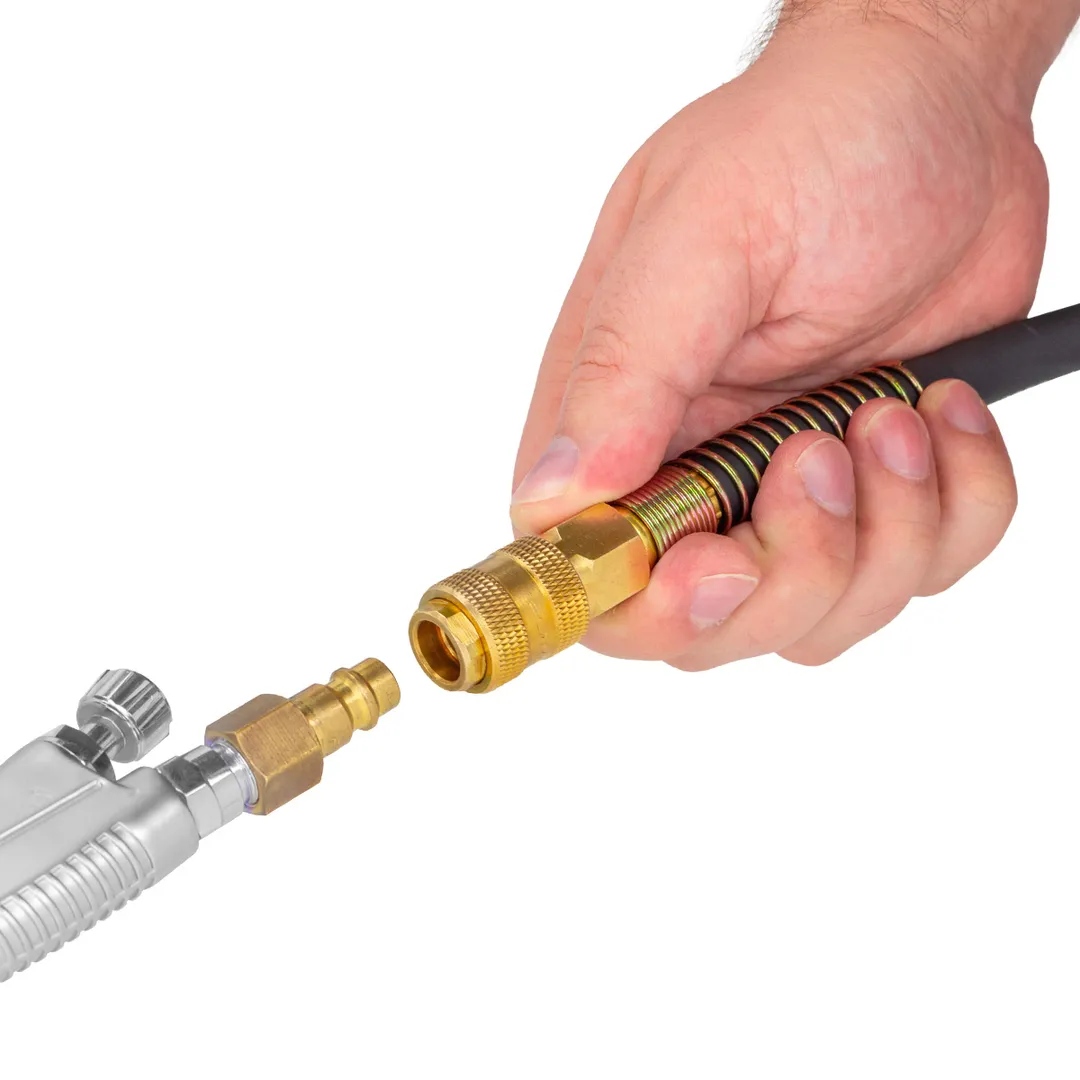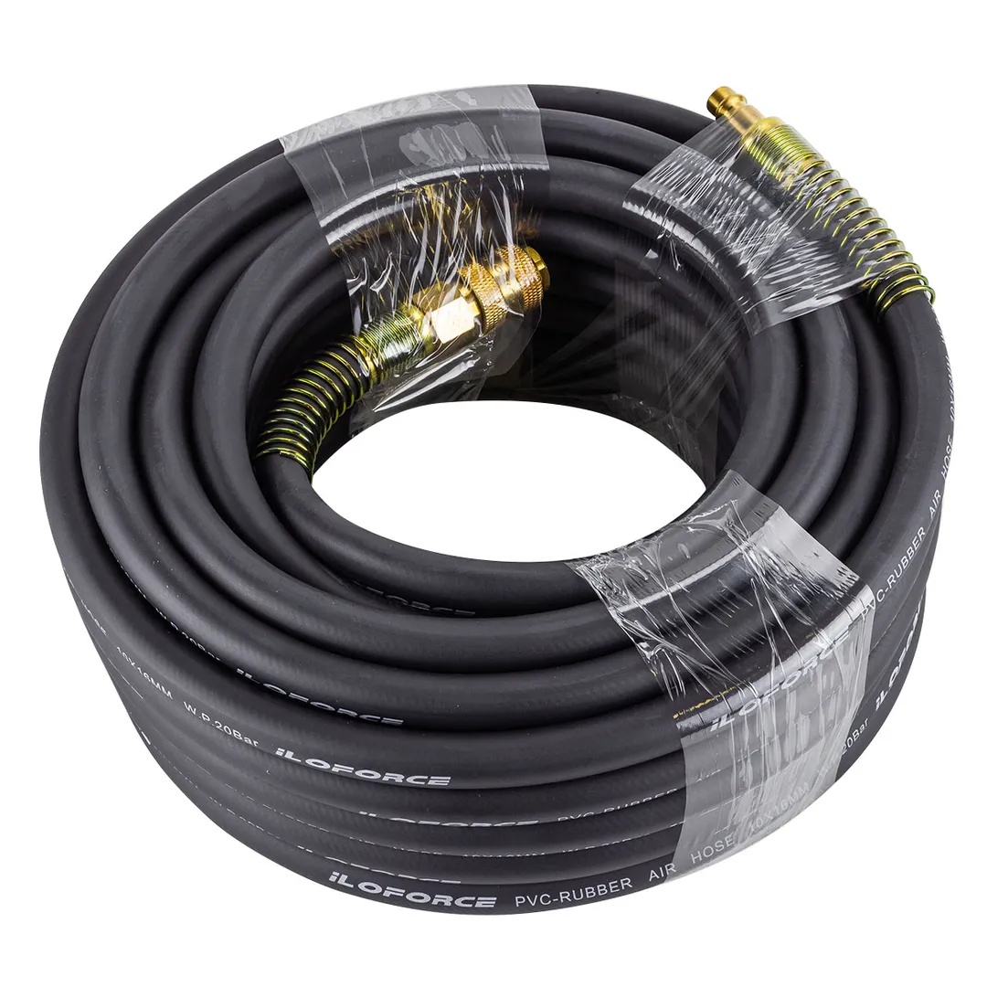 Шланг для компрессора резиновый воздушный армированный с фитингами 10 мм x 16 мм 15 м используется для подключения пневмоинструмента к компрессору при работе с сжатым воздухом. Воздушный шланг произведен из армированной резины, устойчивой к изнашиванию. Полимерная оболочка выдерживает многократное применение без разрывов, за счет чего обеспечиваются герметичность и длительная эксплуатация. Пневмошланг высокого давления оснащен дополнительной защитой в виде стальных пружин, которые предотвращают изламывание шланга в местах крепления, внутренний диаметр 10 мм и внешний диаметр 16 мм. Также благодаря армированию изделие выдерживает высокие нагрузки по давлению сжатого воздуха до 65 бар, рабочее давление 22 бар. Толщина стенки шланга составляет 3 мм, что придает ему высокую механическую прочность и долговечность. Быстросъемы изготовлены из латуни, устойчивые к коррозии и деформации. Соединение муфт обеспечивает удобство и долговечность эксплуатации. Область фиксации креплений усилена, что позволяет избежать перег