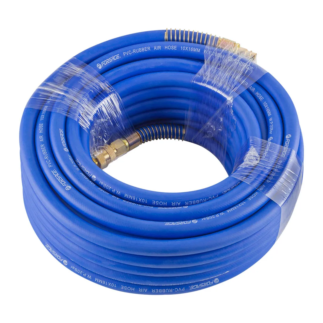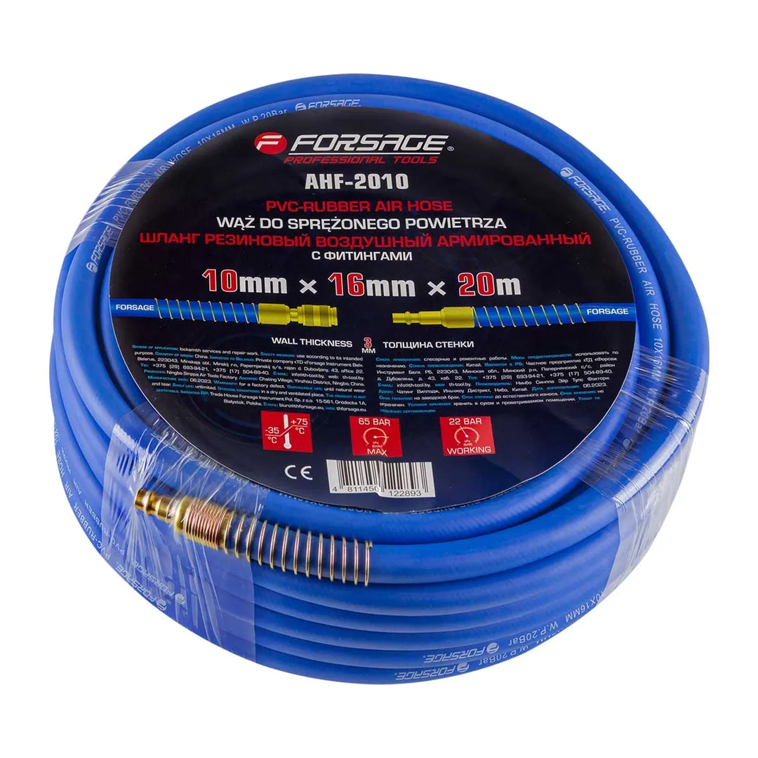 Шланг для компрессора резиновый воздушный армированный с фитингами 10 мм x 16 мм 20 м используется для подключения пневмоинструмента к компрессору при работе с сжатым воздухом. Воздушный шланг произведен из армированной резины, устойчивой к изнашиванию. Полимерная оболочка выдерживает многократное применение без разрывов, за счет чего обеспечиваются герметичность и длительная эксплуатация. Пневмошланг высокого давления оснащен дополнительной защитой в виде стальных пружин, которые предотвращают изламывание шланга в местах крепления, внутренний диаметр 10 мм и внешний диаметр 16 мм. Также благодаря армированию изделие выдерживает высокие нагрузки по давлению сжатого воздуха до 65 бар, рабочее давление 22 бар. Толщина стенки шланга составляет 3 мм, что придает ему высокую механическую прочность и долговечность. Быстросъемы изготовлены из латуни, устойчивые к коррозии и деформации. Соединение муфт обеспечивает удобство и долговечность эксплуатации. Область фиксации креплений усилена, что позволяет избежать перег
