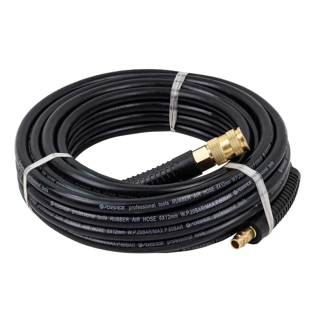 Шланг для компрессора резиновый воздушный армированный с фитингами 6 мм x 12 мм 10 м используется для подключения пневмоинструмента к компрессору при работе с сжатым воздухом. Воздушный шланг произведен из армированной резины, устойчивой к изнашиванию. Полимерная оболочка выдерживает многократное применение без разрывов, за счет чего обеспечиваются герметичность и длительная эксплуатация. Пневмошланг высокого давления оснащен дополнительной защитой в виде пластикового кожуха, который предотвращает изламывание шланга в местах крепления, внутренний диаметр 6 мм и внешний диаметр 12 мм. Также благодаря армированию изделие выдерживает высокие нагрузки по давлению сжатого воздуха до 60 бар, рабочее давление 20 бар. Толщина стенки шланга составляет 3 мм, что придает ему высокую механическую прочность и долговечность. Быстросъемы изготовлены из латуни, устойчивые к коррозии и деформации. Соединение муфт обеспечивает удобство и долговечность эксплуатации. Область фиксации креплений усилена, что позволяет избежать пер