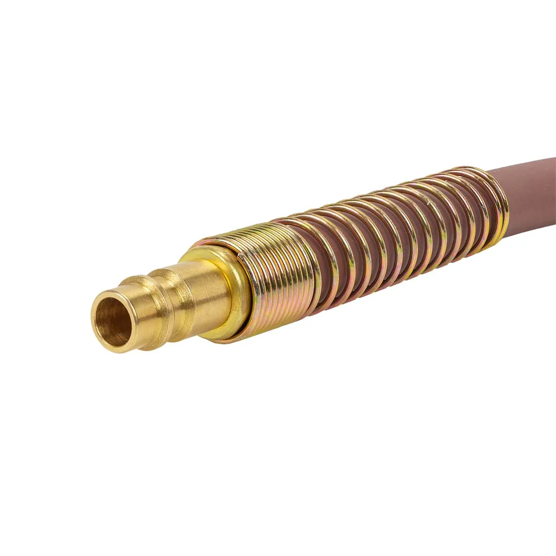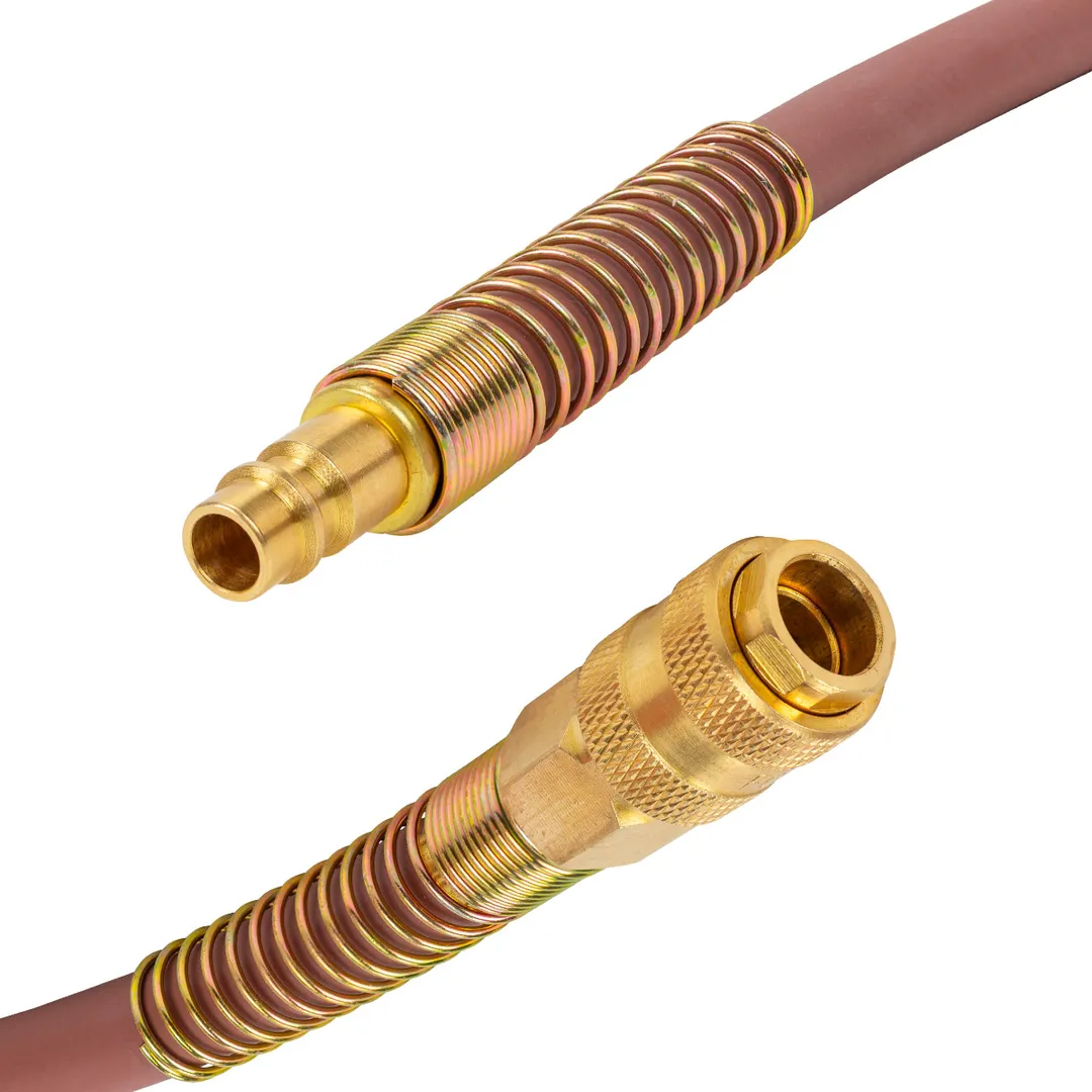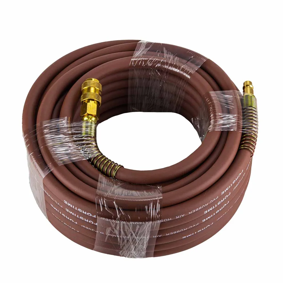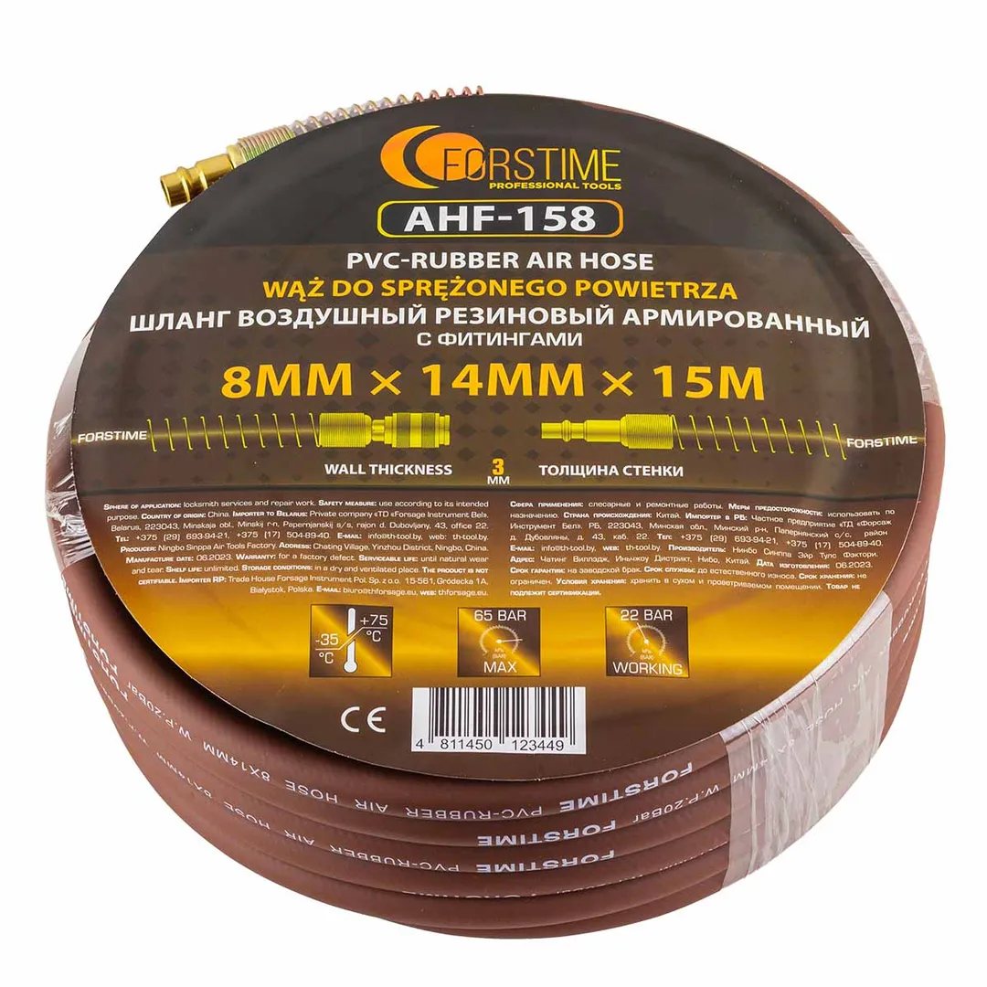 Шланг для компрессора резиновый воздушный армированный с фитингами 8 мм x 14 мм 15 м используется для подключения пневмоинструмента к компрессору при работе с сжатым воздухом. Воздушный шланг произведен из армированной резины, устойчивой к изнашиванию. Полимерная оболочка выдерживает многократное применение без разрывов, за счет чего обеспечиваются герметичность и длительная эксплуатация. Пневмошланг высокого давления оснащен дополнительной защитой в виде стальных пружин, которые предотвращают изламывание шланга в местах крепления, внутренний диаметр 8 мм и внешний диаметр 14 мм. Также благодаря армированию изделие выдерживает высокие нагрузки по давлению сжатого воздуха до 65 бар, рабочее давление 22 бар. Толщина стенки шланга составляет 3 мм, что придает ему высокую механическую прочность и долговечность. Быстросъемы изготовлены из латуни, устойчивые к коррозии и деформации. Соединение муфт обеспечивает удобство и долговечность эксплуатации. Область фиксации креплений усилена, что позволяет избежать перегиб