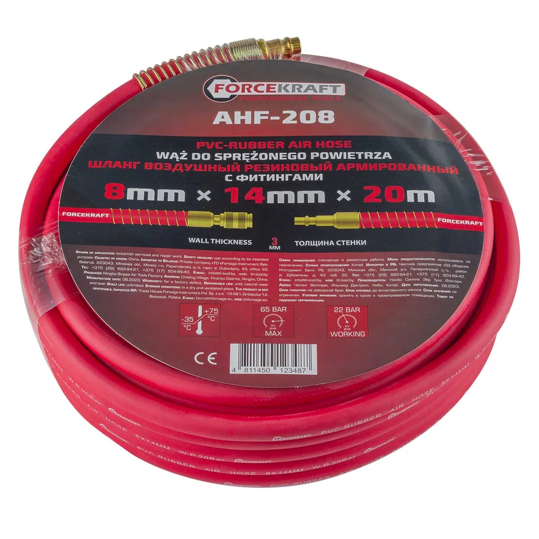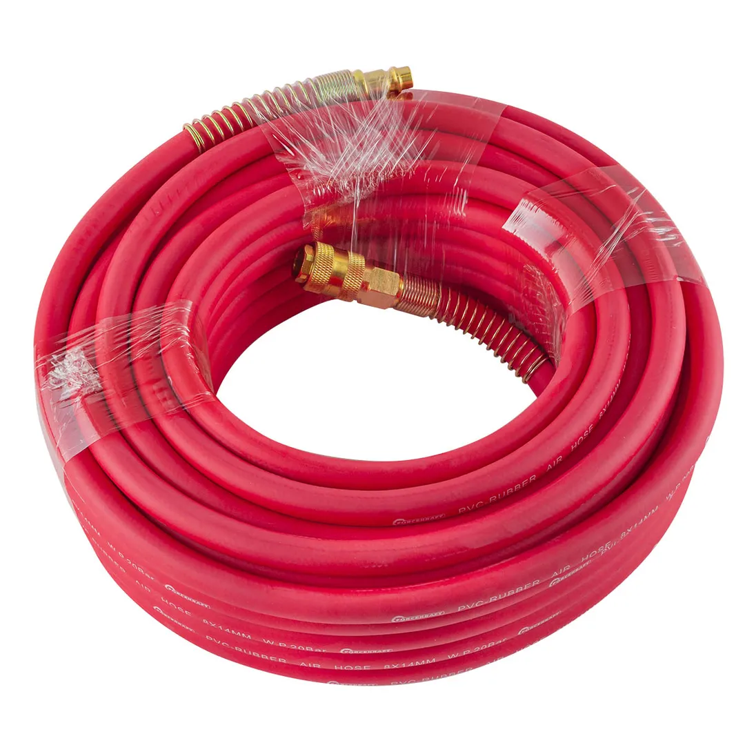 Шланг для компрессора резиновый воздушный армированный с фитингами 8 мм x 14 мм 20 м используется для подключения пневмоинструмента к компрессору при работе с сжатым воздухом. Воздушный шланг произведен из армированной резины, устойчивой к изнашиванию. Полимерная оболочка выдерживает многократное применение без разрывов, за счет чего обеспечиваются герметичность и длительная эксплуатация. Пневмошланг высокого давления оснащен дополнительной защитой в виде стальных пружин, которые предотвращают изламывание шланга в местах крепления, внутренний диаметр 8 мм и внешний диаметр 14 мм. Также благодаря армированию изделие выдерживает высокие нагрузки по давлению сжатого воздуха до 65 бар, рабочее давление 22 бар. Толщина стенки шланга составляет 3 мм, что придает ему высокую механическую прочность и долговечность. Быстросъемы изготовлены из латуни, устойчивые к коррозии и деформации. Соединение муфт обеспечивает удобство и долговечность эксплуатации. Область фиксации креплений усилена, что позволяет избежать перегиб