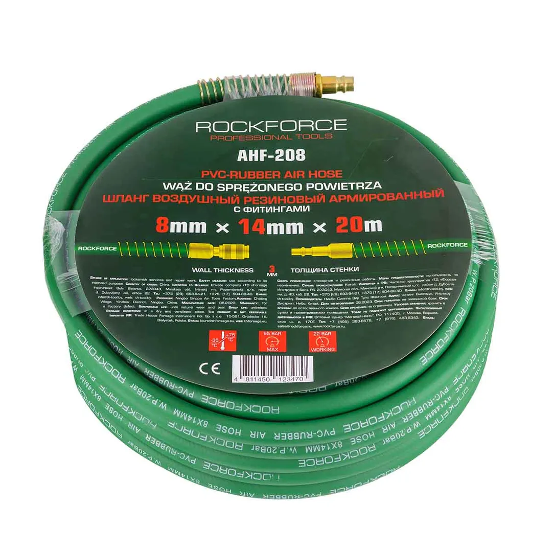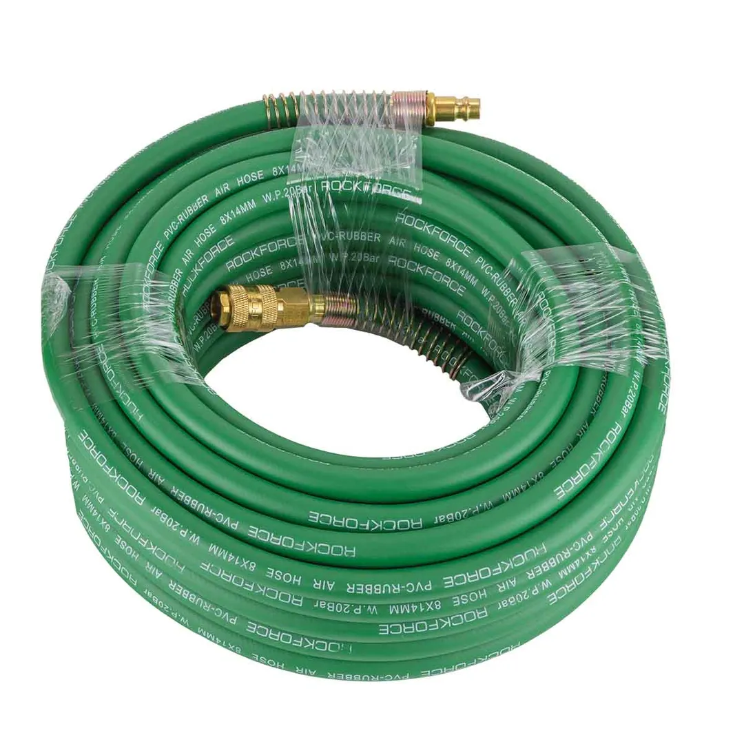 Шланг для компрессора резиновый воздушный армированный с фитингами 8 мм x 14 мм 20 м используется для подключения пневмоинструмента к компрессору при работе с сжатым воздухом. Воздушный шланг произведен из армированной резины, устойчивой к изнашиванию. Полимерная оболочка выдерживает многократное применение без разрывов, за счет чего обеспечиваются герметичность и длительная эксплуатация. Пневмошланг высокого давления оснащен дополнительной защитой в виде стальных пружин, которые предотвращают изламывание шланга в местах крепления, внутренний диаметр 8 мм и внешний диаметр 14 мм. Также благодаря армированию изделие выдерживает высокие нагрузки по давлению сжатого воздуха до 60 бар, рабочее давление 20 бар. Толщина стенки шланга составляет 3 мм, что придает ему высокую механическую прочность и долговечность. Быстросъемы изготовлены из латуни, устойчивые к коррозии и деформации. Соединение муфт обеспечивает удобство и долговечность эксплуатации. Область фиксации креплений усилена, что позволяет избежать перегиб
