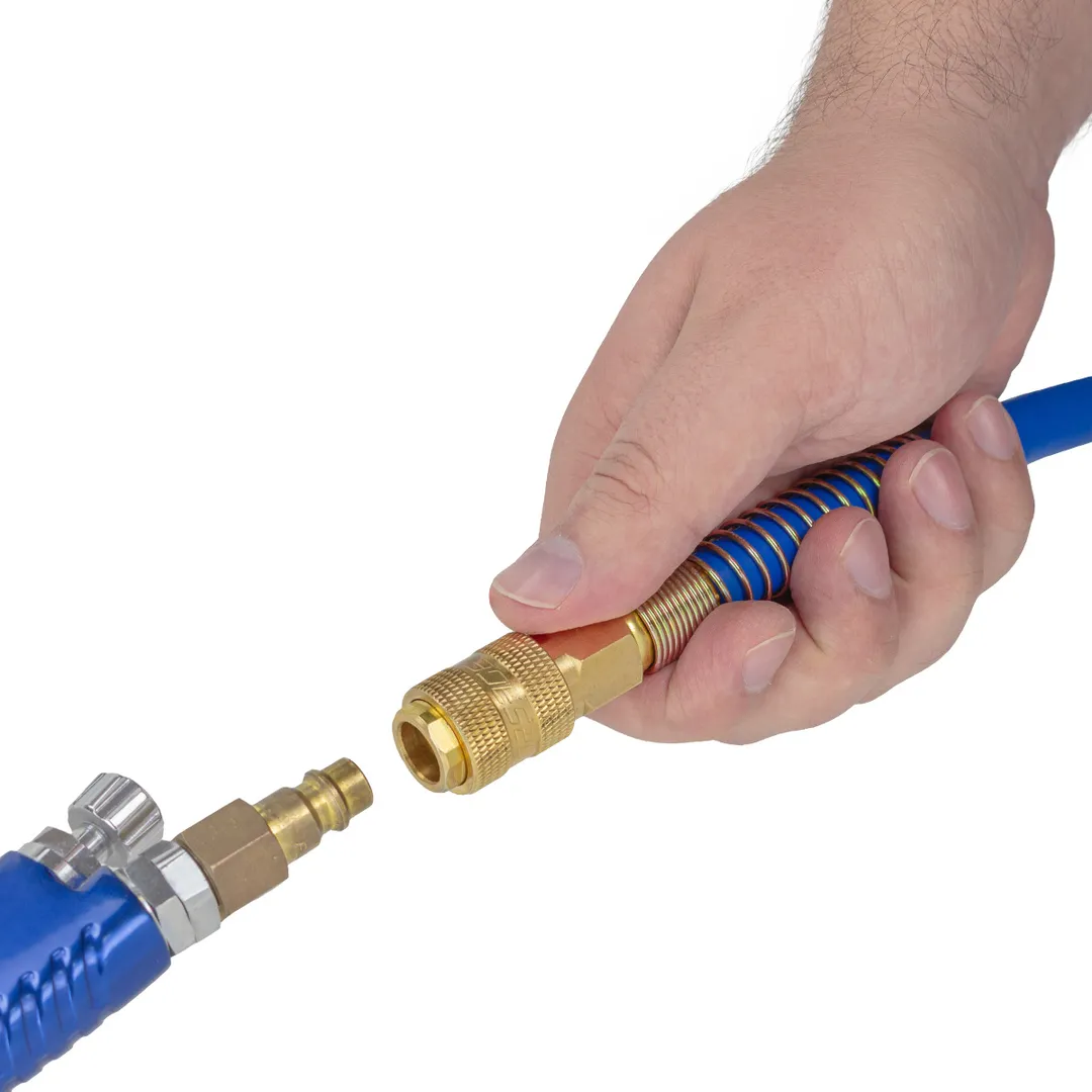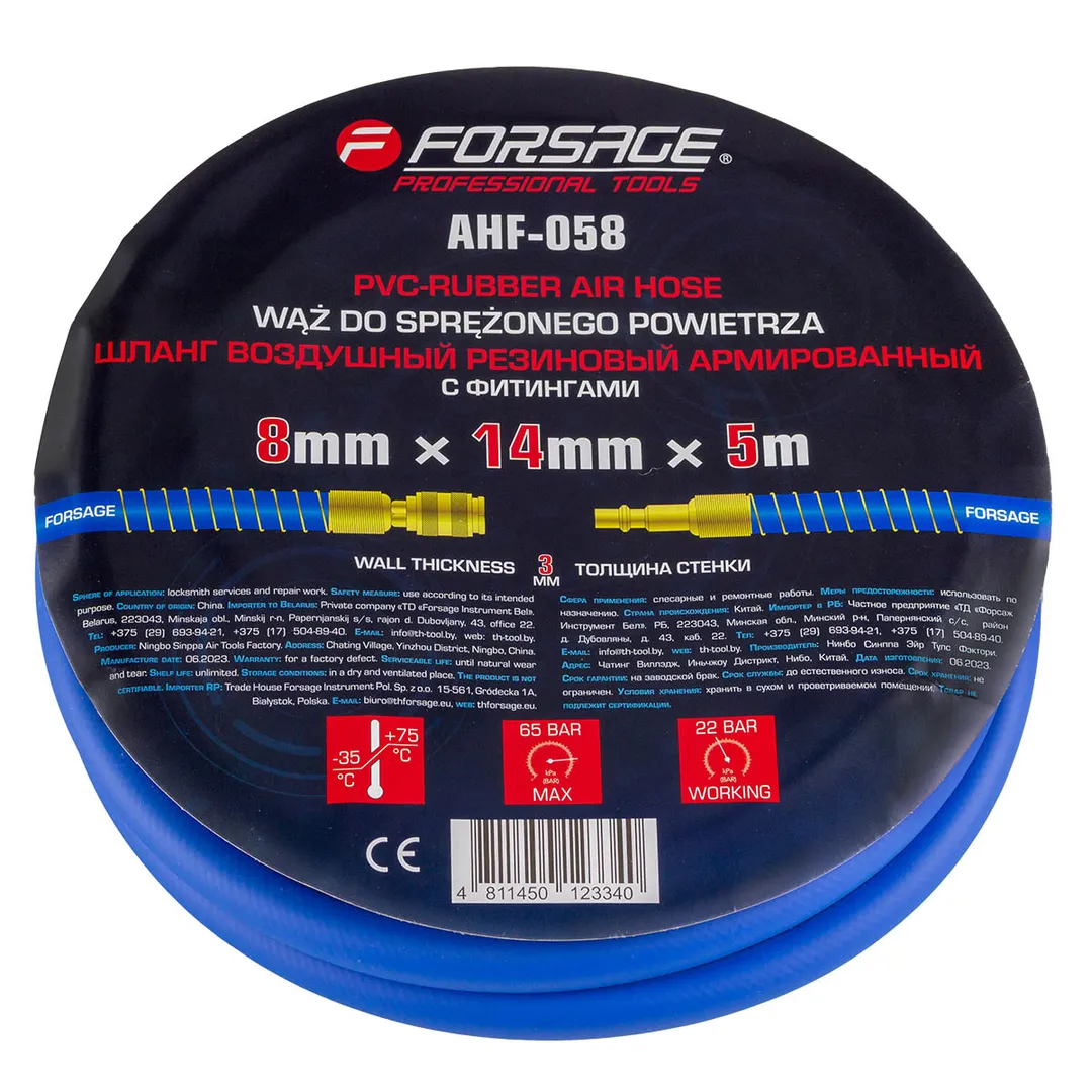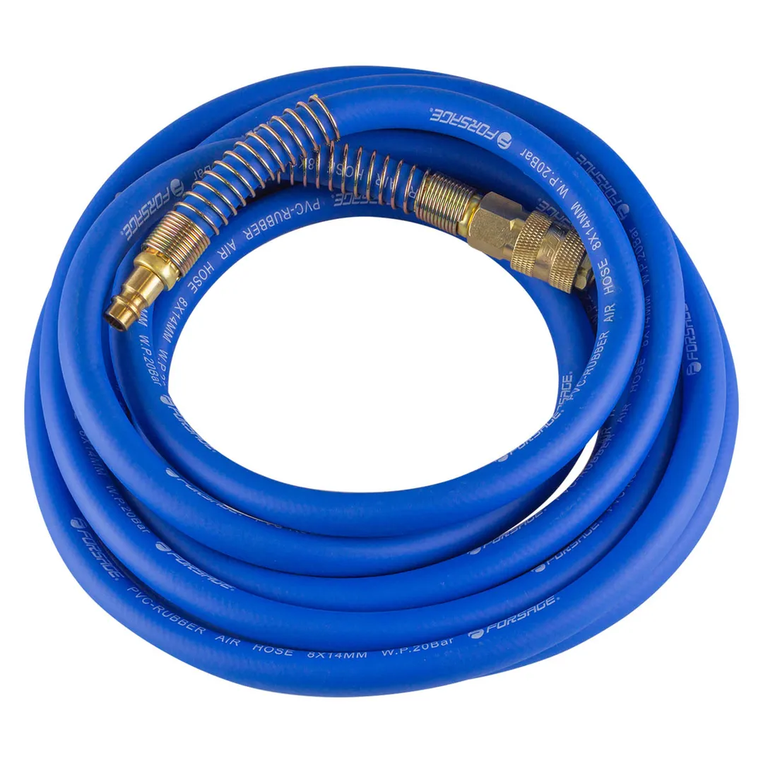 Шланг для компрессора резиновый воздушный армированный с фитингами 8 мм x 14 мм 5 м используется для подключения пневмоинструмента к компрессору при работе с сжатым воздухом. Воздушный шланг произведен из армированной резины, устойчивой к изнашиванию. Полимерная оболочка выдерживает многократное применение без разрывов, за счет чего обеспечиваются герметичность и длительная эксплуатация. Пневмошланг высокого давления оснащен дополнительной защитой в виде стальных пружин, которые предотвращают изламывание шланга в местах крепления, внутренний диаметр 8 мм и внешний диаметр 14 мм. Также благодаря армированию изделие выдерживает высокие нагрузки по давлению сжатого воздуха до 65 бар, рабочее давление 22 бар. Толщина стенки шланга составляет 3 мм, что придает ему высокую механическую прочность и долговечность. Быстросъемы изготовлены из латуни, устойчивые к коррозии и деформации. Соединение муфт обеспечивает удобство и долговечность эксплуатации. Область фиксации креплений усилена, что позволяет избежать перегибо