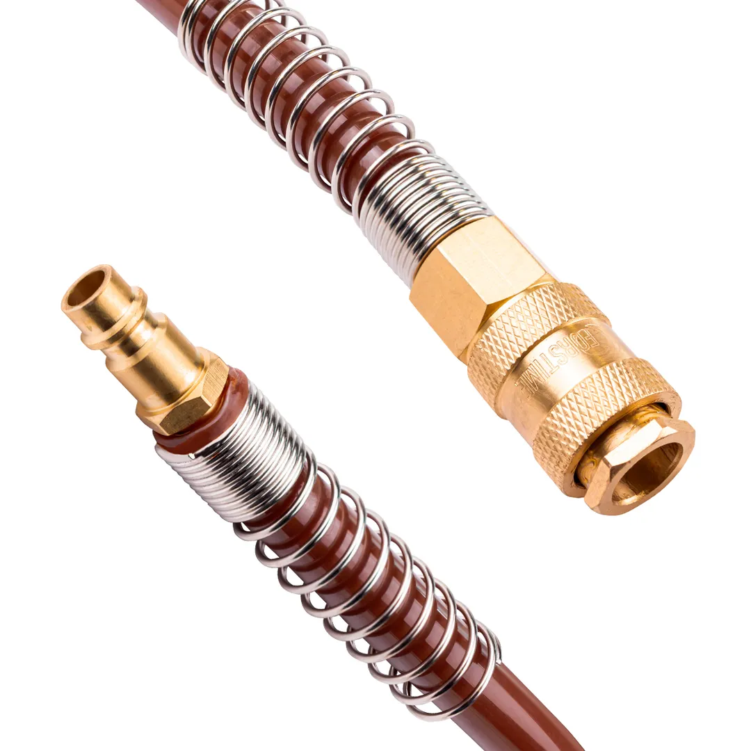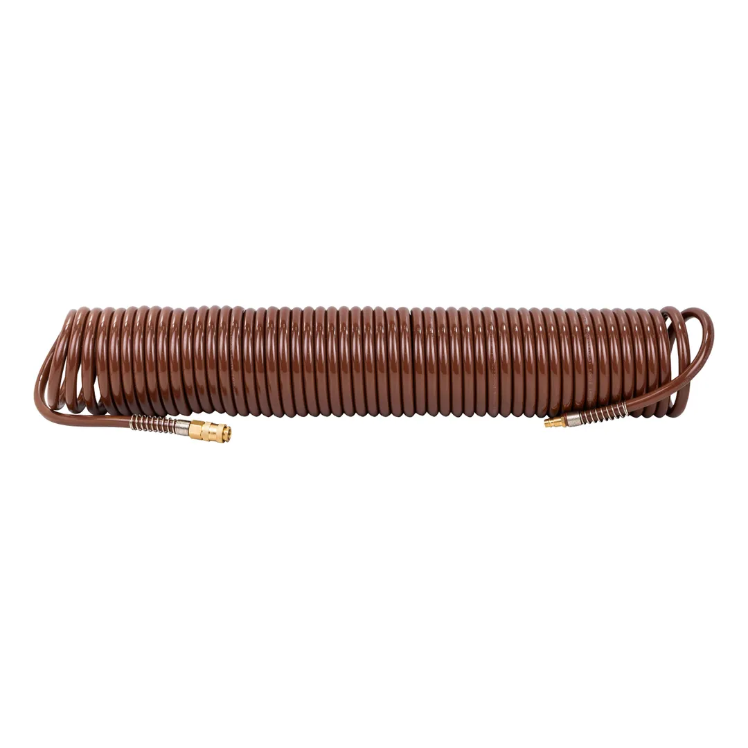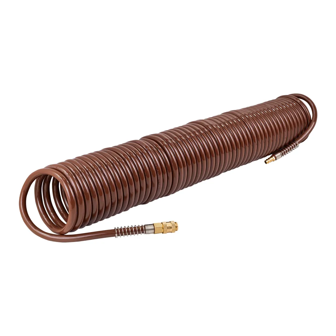 Шланг пневматический витой полиуретановый, внутренний диаметр 10 мм, наружный диаметр 14 мм, длина 20 м, максимальное давление 15 бар, рабочая температура от -20 до +60°C, оснащён штуцерами рапид "мама" с одной стороны и рапид "папа" с другой, изготовлен из прочного и эластичного полиуретана, спиральная конструкция предотвращает перегибы и запутывание, обеспечивает удобство эксплуатации и компактное хранение, предназначен для подачи сжатого воздуха от компрессора к пневматическому инструменту в автосервисах, мастерских и на производстве.