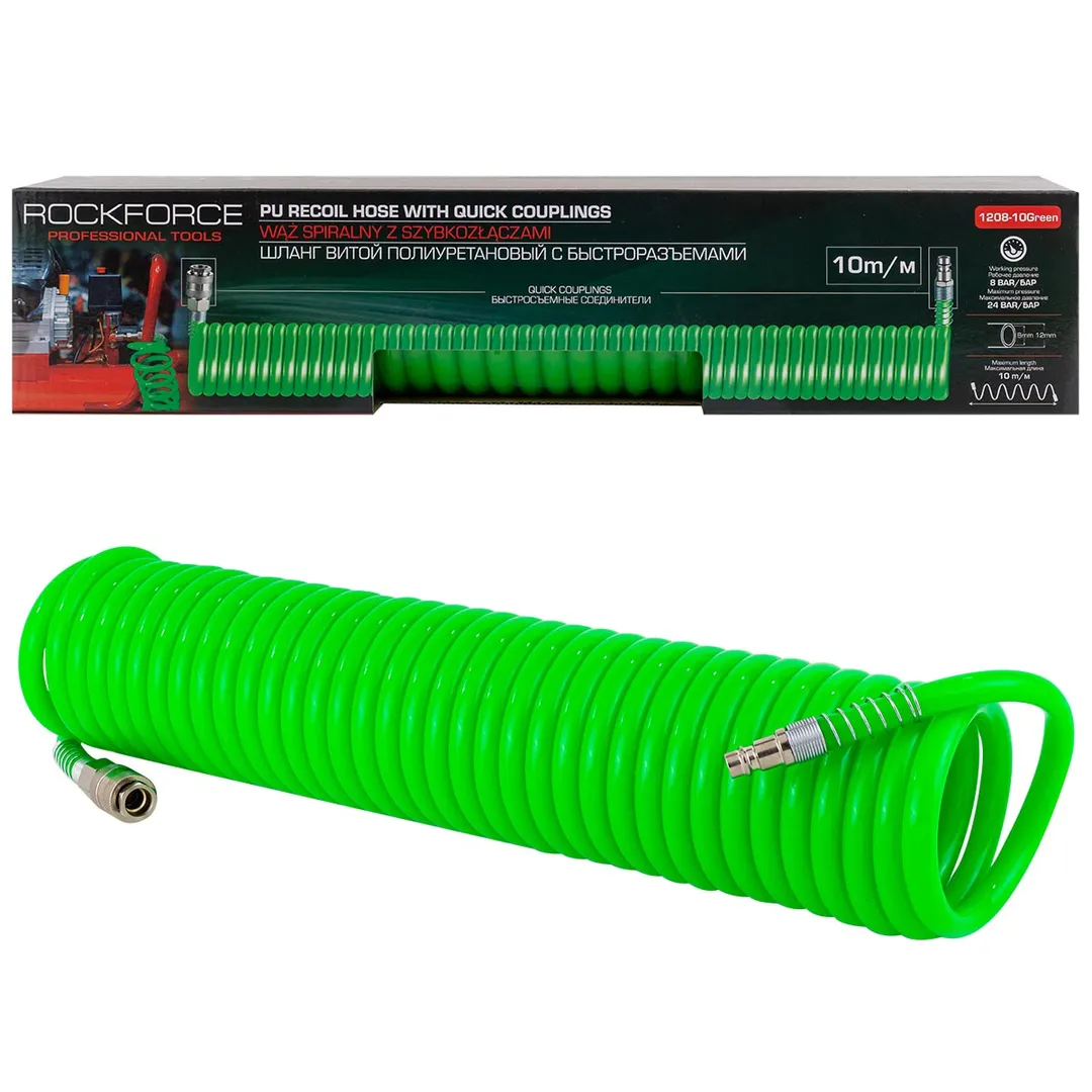 Полиуретановый витой шланг с быстроразъемами из нержавеющей стали является универсальным и подходит для большинства воздушных компрессоров и другого пневматического оборудования. Витая структура шланга обеспечивает его гибкость и помогает избегать защемления или закручивания, что делает его долговечным в использовании. На двух концах шланга присоединены латунные быстросъемные соединения. Максимальное допустимое давление - 24 бар, рабочее давление - 8 бар, рабочая температура от -20° до +60°.
