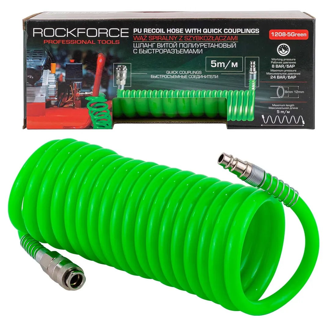 Полиуретановый витой шланг с быстроразъемами из нержавеющей стали является универсальным и подходит для большинства воздушных компрессоров и другого пневматического оборудования. Витая структура шланга обеспечивает его гибкость и помогает избегать защемления или закручивания, что делает его долговечным в использовании. На двух концах шланга присоединены латунные быстросъемные соединения. Максимальное допустимое давление - 24 бар, рабочее давление - 8 бар, рабочая температура от -20° до +60°.