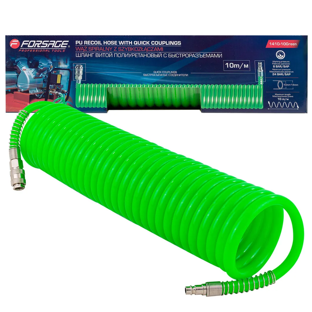 Полиуретановый витой шланг с быстроразъемами из нержавеющей стали является универсальным и подходит для большинства воздушных компрессоров и другого пневматического оборудования. Витая структура шланга обеспечивает его гибкость и помогает избегать защемления или закручивания, что делает его долговечным в использовании. На двух концах шланга присоединены латунные быстросъемные соединения. Максимальное допустимое давление - 24 бар, рабочее давление - 8 бар, рабочая температура от -20° до +60°.
