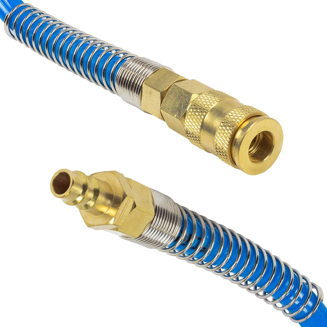 Шланг пневматический витой полиуретановый применяется для подачи воздуха от компрессора к пневматическому инструменту. Изготовлен из полиуретана, отличается прочностью и удобством эксплуатации. Спиральное исполнение шланга предотвращает его перегибы. Шланг оснащён штуцером рапид мама с одной стороны и рапид папа с другой.