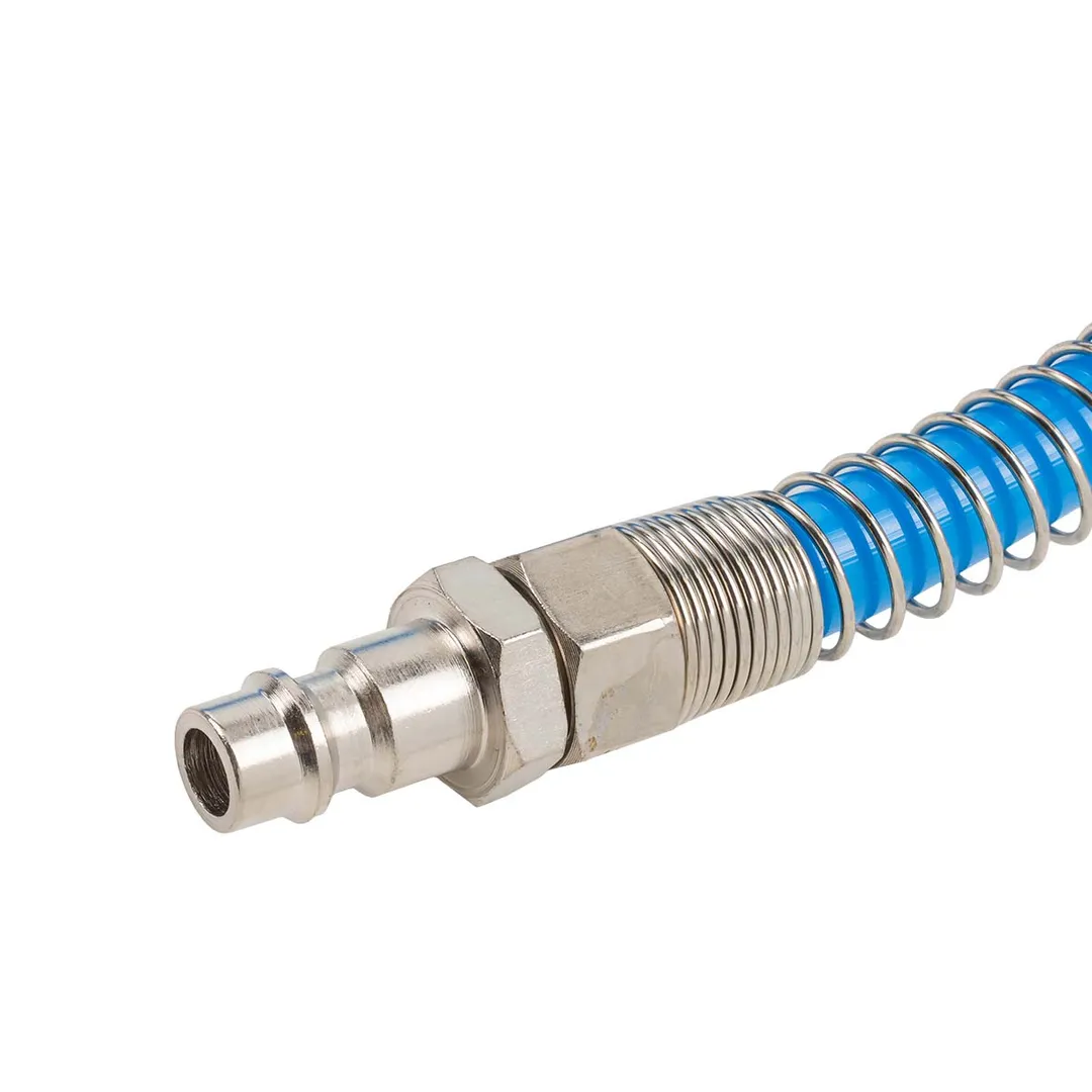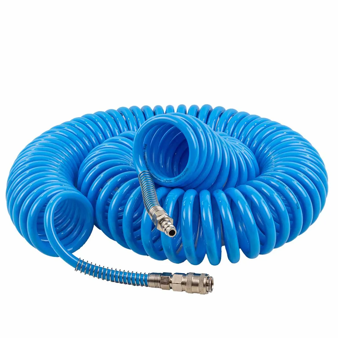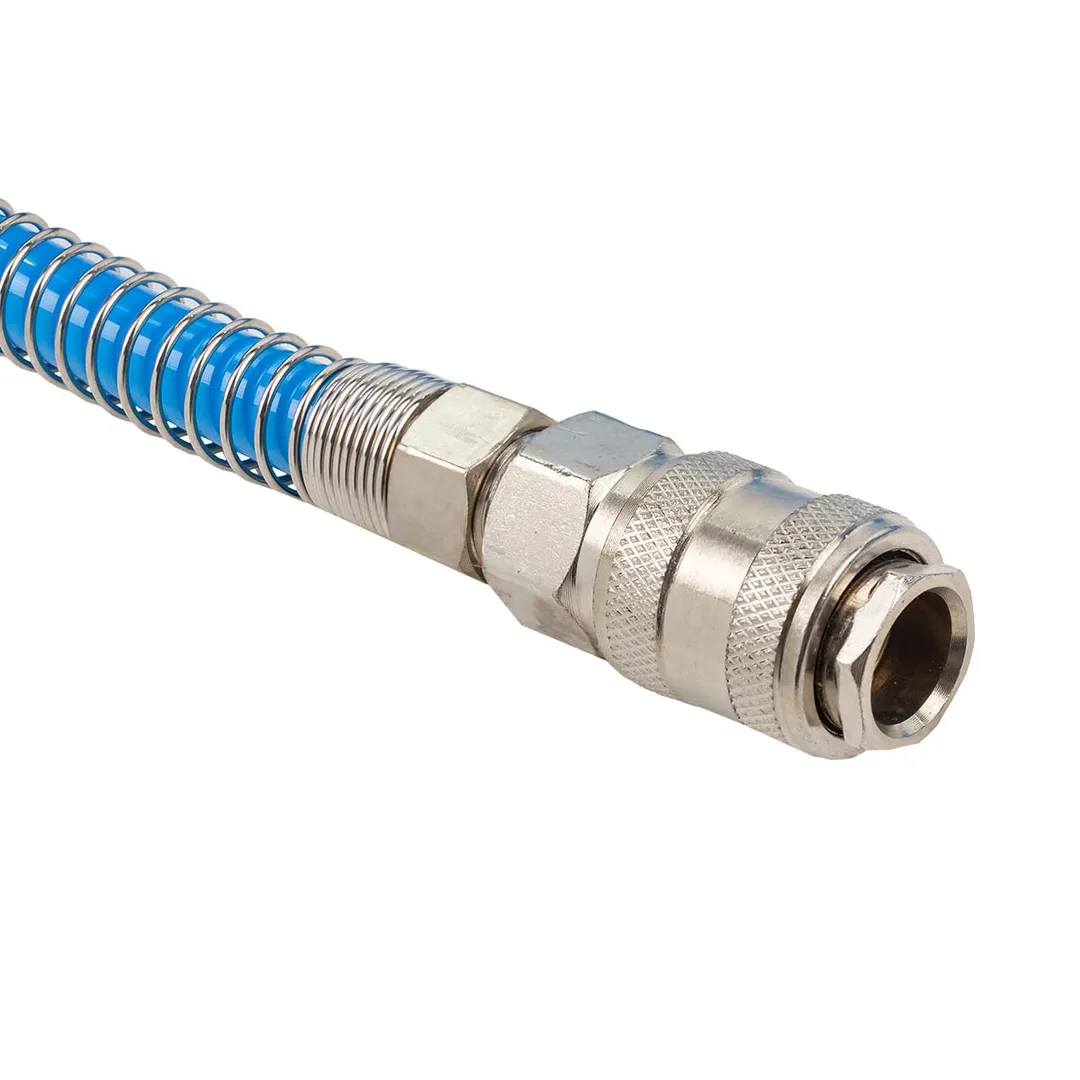 Шланг пневматический витой полиуретановый применяется для подачи воздуха от компрессора к пневматическому инструменту. Изготовлен из полиуретана, отличается прочностью и удобством эксплуатации. Спиральное исполнение шланга предотвращает его перегибы. Шланг оснащён штуцером рапид мама с одной стороны и рапид папа с другой.