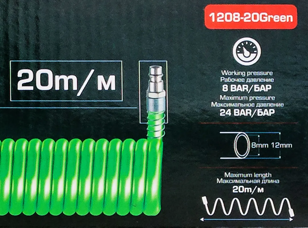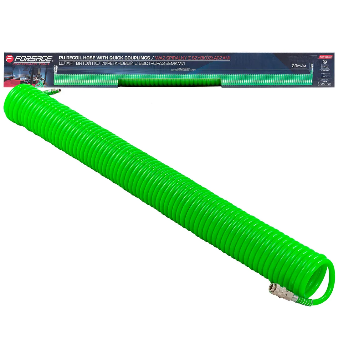Полиуретановый витой шланг с быстроразъемами из нержавеющей стали является универсальным и подходит для большинства воздушных компрессоров и другого пневматического оборудования. Витая структура шланга обеспечивает его гибкость и помогает избегать защемления или закручивания, что делает его долговечным в использовании. На двух концах шланга присоединены латунные быстросъемные соединения. Максимальное допустимое давление - 24 бар, рабочее давление - 8 бар, рабочая температура от -20° до +60°.