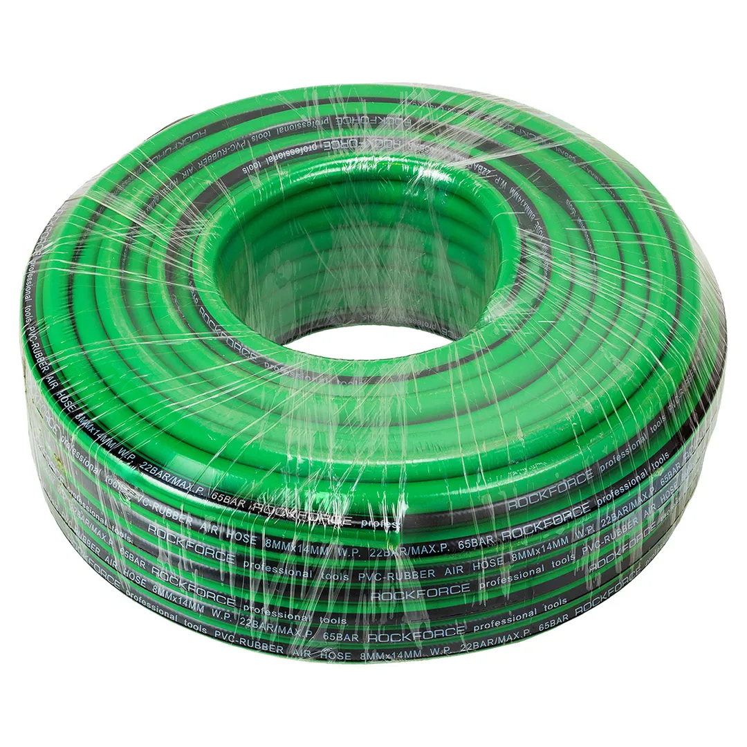 Шланг для компрессора резиновый воздушный армированный 8 мм x 14 мм х 50м используется для подключения пневмоинструмента к компрессору при работе с сжатым воздухом. Воздушный шланг произведен из армированной резины, устойчивой к изнашиванию. Полимерная оболочка выдерживает многократное применение без разрывов, за счет чего обеспечиваются герметичность и длительная эксплуатация. Также благодаря армированию изделие выдерживает высокие нагрузки по давлению сжатого воздуха до 60 бар, рабочее давление 20 бар. Толщина стенки шланга составляет 3 мм, что придает ему высокую механическую прочность и долговечность. Шланг может храниться и эксплуатироваться при температурах от -30 до +70 градусов Цельсия.