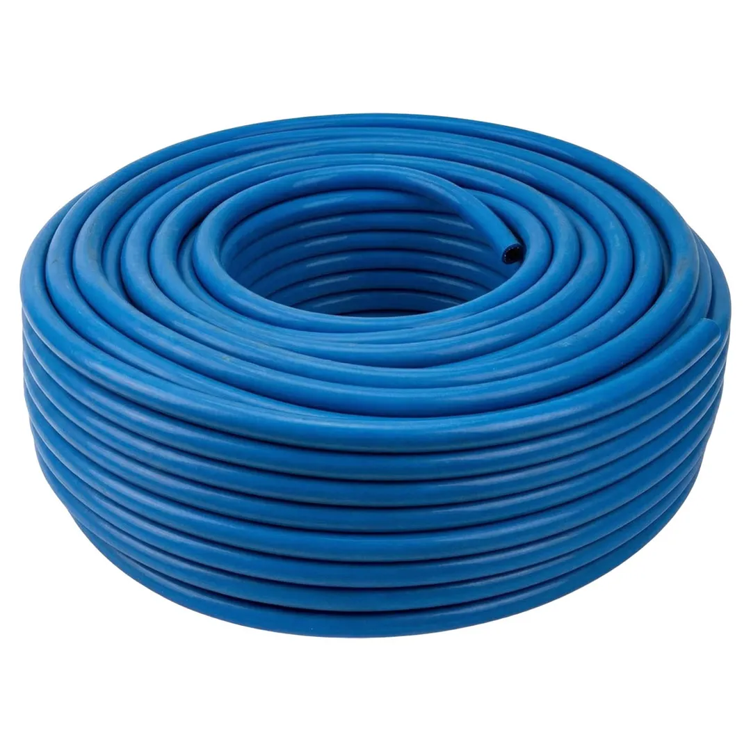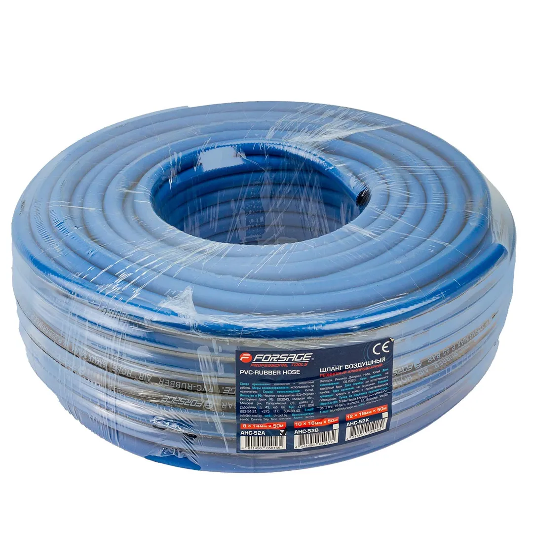 Шланг для компрессора резиновый воздушный армированный 8 мм x 14 мм х 50м используется для подключения пневмоинструмента к компрессору при работе с сжатым воздухом. Воздушный шланг произведен из армированной резины, устойчивой к изнашиванию. Полимерная оболочка выдерживает многократное применение без разрывов, за счет чего обеспечиваются герметичность и длительная эксплуатация. Также благодаря армированию изделие выдерживает высокие нагрузки по давлению сжатого воздуха до 60 бар, рабочее давление 20 бар. Толщина стенки шланга составляет 3 мм, что придает ему высокую механическую прочность и долговечность. Шланг может храниться и эксплуатироваться при температурах от -30 до +70 градусов Цельсия.
