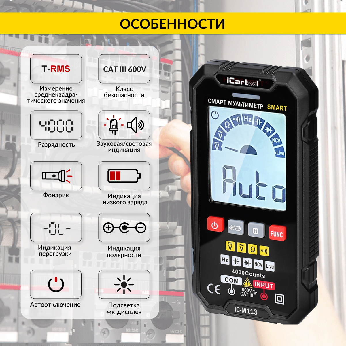 Цифровой смарт-мультиметр IC-M113 с технологией измерения значений True RMS, большим ЖК-дисплеем и классическим набором функций. Отличается малым весом и оригинальным современным дизайном. Подсветка экрана и яркий фонарик, встроенный в мультиметр помогут произвести замеры в условиях недостаточной освещенности. Незаменим для домашних ремонтных работ по электрике, в гараже для обслуживания электроцепей автомобиля и для радиолюбителей.