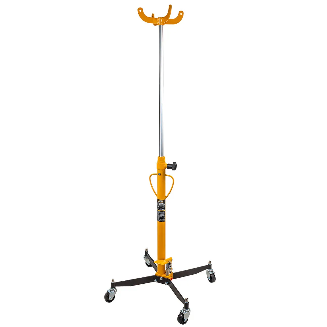 Стойка трансмиссионная гидравлическая применяется для монтажа или демонтажа КПП и также всевозможных элементов выхлопной системы, защиты поддона картера. Поставляется в комплекте с дополнительным адаптером для снятия КПП. Адаптер имеет разборную конструкцию, он легко устанавливается на рабочий шток и надёжно закрепляется. Благодаря этому устройству можно эффективно проводить работы по починке автомобилей на станциях технического обслуживания. Подъем осуществляется при помощи ножного насоса, опускание путем откручивания клапана вручную. Подъем и опускание дозировано с предельной точностью.