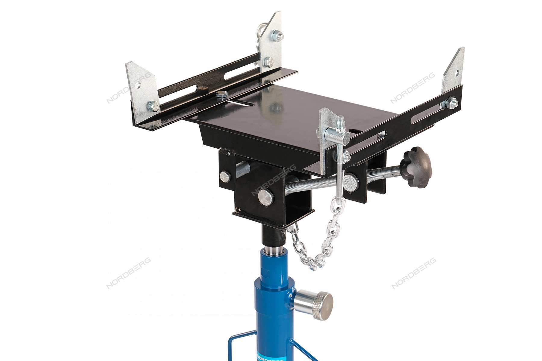 - Установочная регулируемая платформа вместо обычной приёмной насадки позволяет надежно расположить на ней агрегаты. Благодаря удобным регулировкам, платформа может изменять длину и ширину расположения ограничителей для лучшего захвата агрегата, а также изменять угол наклона, тем самым позволяя подстроиться под различные конфигурации демонтируемых/монтируемых узлов. Также платформа имеет цепь для обвязки агрегата с целью его жесткой фиксации на платформе во избежание падения агрегата со стойки во время снятия или установки на автомобиль.
